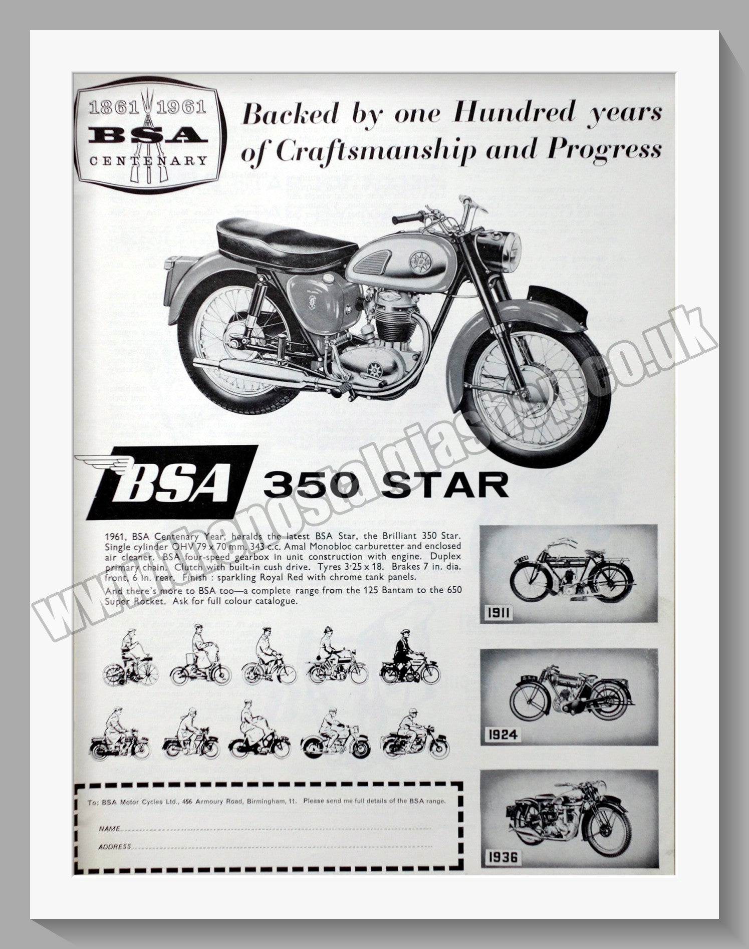 B.S.A. 350 Star Motor Cycle. Classic Original Vintage Advert 1960. Presented and Supplied in a cream bevel cut mount with backing card and Clear Bag. Ready to fit in 14 x 11 inch frame. All our adverts, unless clearly stated are Originals from the date shown They make excellent pieces of wall art and stunning gifts. Many are rare and hard to find and once sold, may not be replaced. Remember you are buying a piece of history. Website watermark is not on original. BSA Motor Cycles. Vintage Motorbike Adverts.
