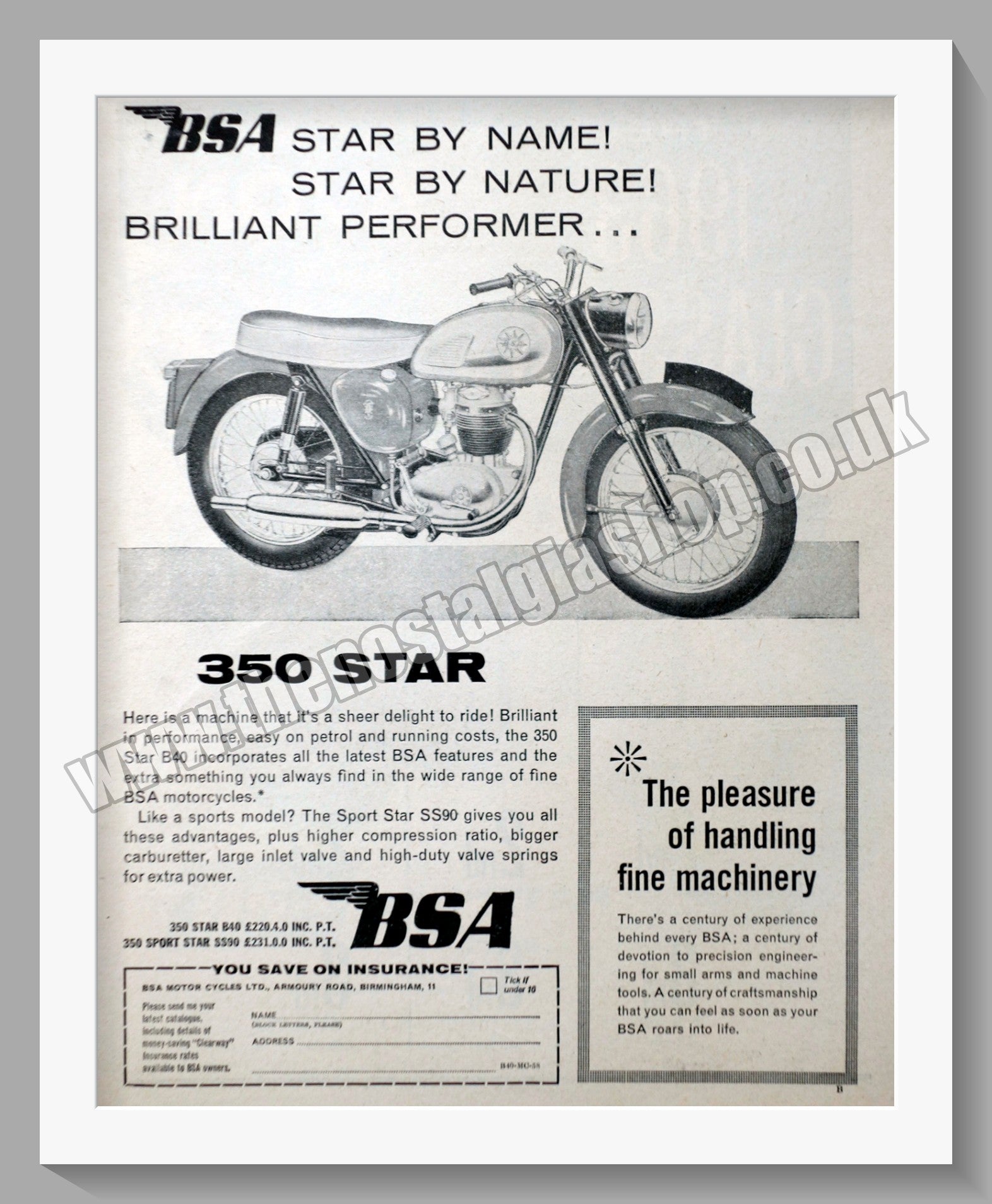 B.S.A. 350 Star Motor Cycle. Classic Original Vintage Advert 1963. Presented and Supplied in a cream bevel cut mount with backing card and Clear Bag. Ready to fit in 14 x 11 inch frame. All our adverts, unless clearly stated are Originals from the date shown They make excellent pieces of wall art and stunning gifts. Many are rare and hard to find and once sold, may not be replaced. Remember you are buying a piece of history. Website watermark is not on original. BSA Motor Cycles. Vintage Motorbike Adverts.