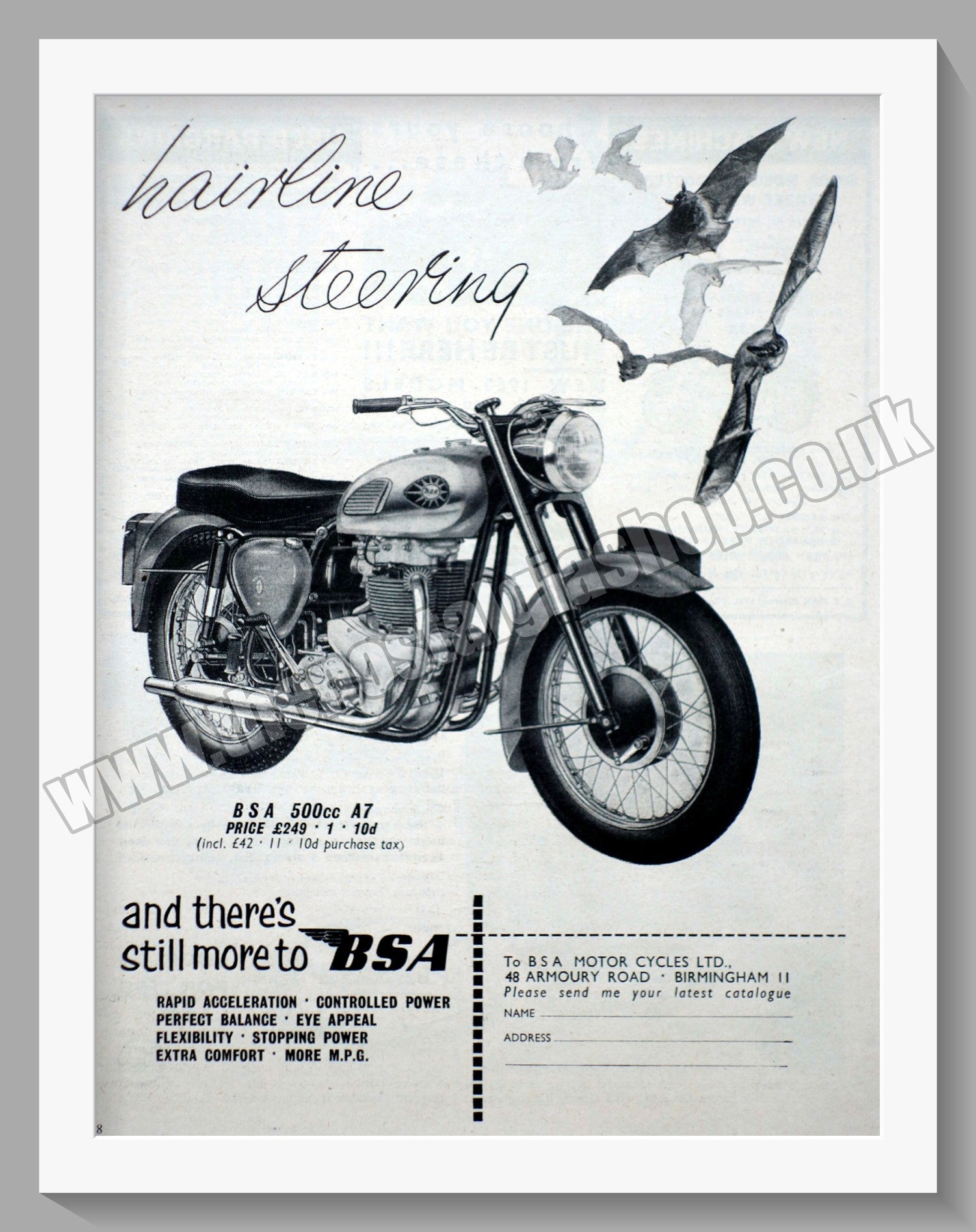 B.S.A. 500 Twin Shooting Star Motor Cycle. Hairline Steering. Classic Original Vintage Advert 1959. Presented and Supplied in a cream bevel cut mount with backing card and Clear Bag. Ready to fit in 14 x 11 inch frame. All our adverts, unless clearly stated are Originals from the date shown They make excellent pieces of wall art and stunning gifts. Many are rare and hard to find and once sold, may not be replaced. Remember you are buying a piece of history. Website watermark is not on original. BSA Motor Cycles. Vintage Motorbike Adverts.