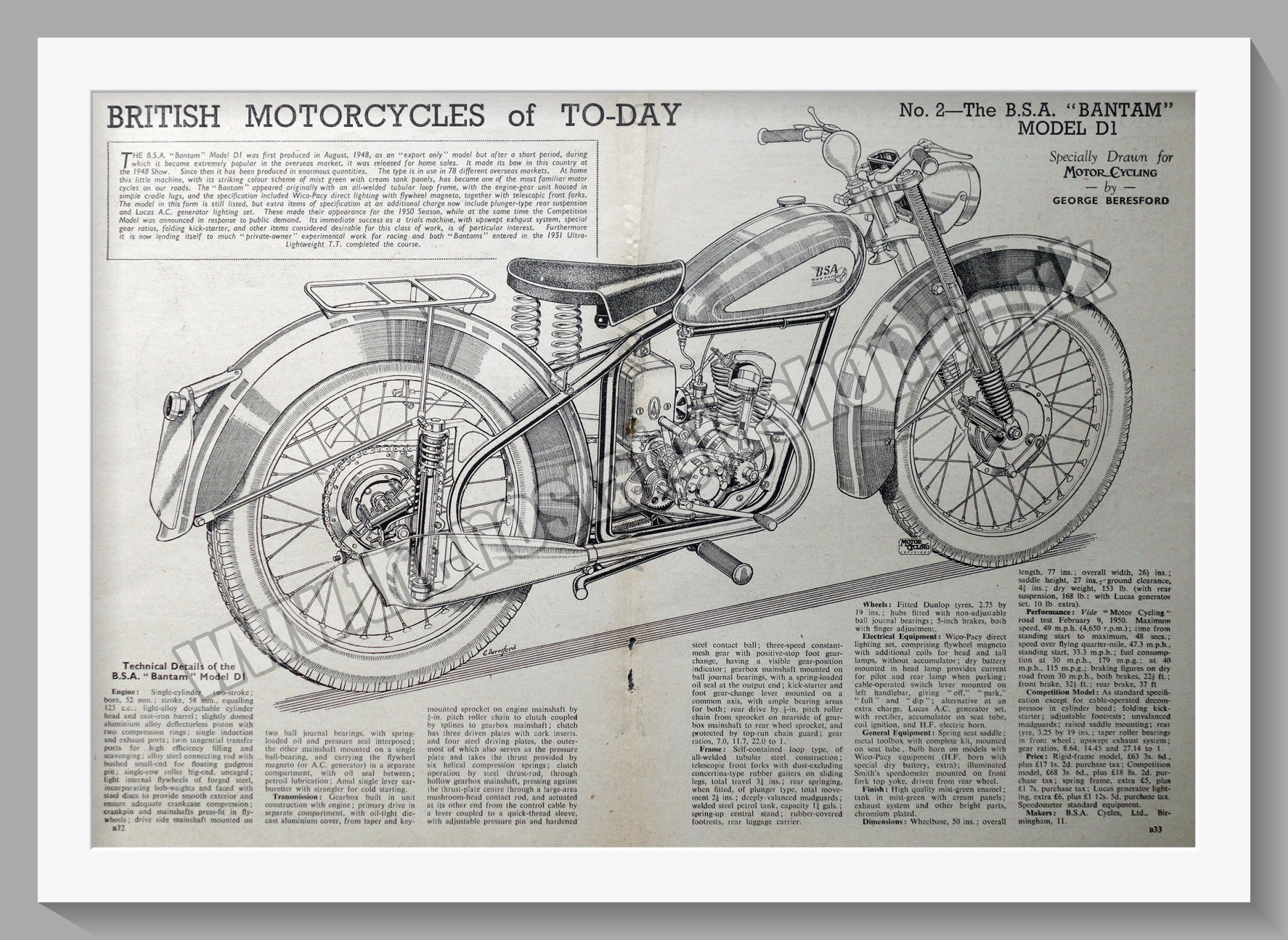 BSA Bantam Model D1 Motorcycle. Technical Print from 1951 (ref AD14520)