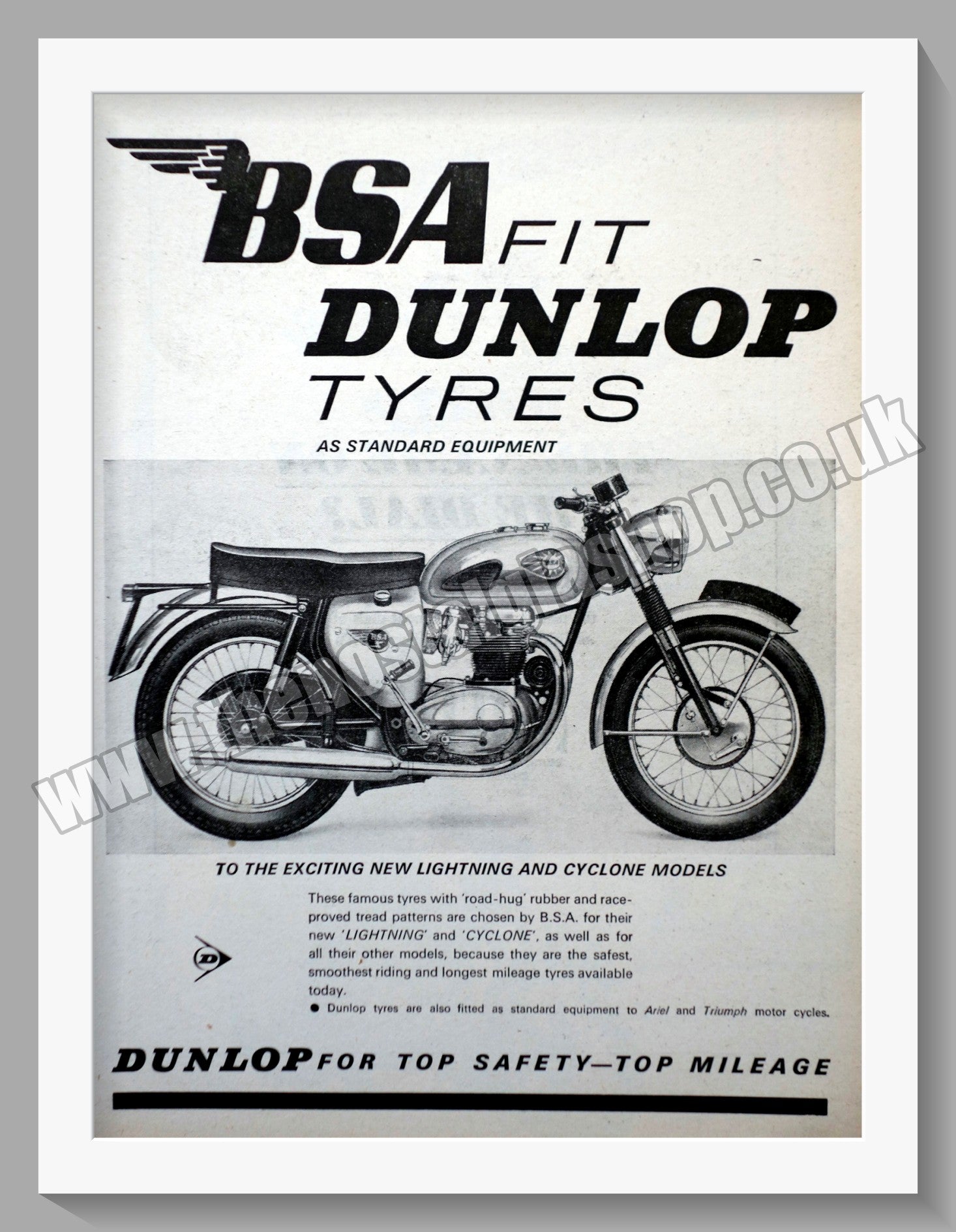 B.S.A. Dunlop Tyres. Classic Original Vintage Advert 1964. Presented and Supplied in a cream bevel cut mount with backing card and Clear Bag. Ready to fit in 14 x 11 inch frame. All our adverts, unless clearly stated are Originals from the date shown They make excellent pieces of wall art and stunning gifts. Many are rare and hard to find and once sold, may not be replaced. Remember you are buying a piece of history. Website watermark is not on original. BSA Motor Cycles. Vintage Motorbike Adverts.