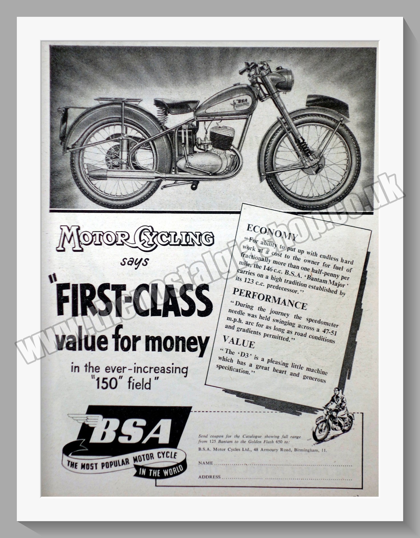 B.S.A. Motorcycle. Classic Original Vintage Advert 1955. Presented and Supplied in a cream bevel cut mount with backing card and Clear Bag. Ready to fit in 14 x 11 inch frame. All our adverts, unless clearly stated are Originals from the date shown They make excellent pieces of wall art and stunning gifts. Many are rare and hard to find and once sold, may not be replaced. Remember you are buying a piece of history. Website watermark is not on original. BSA Motor Cycles. Vintage Motorbike Adverts.