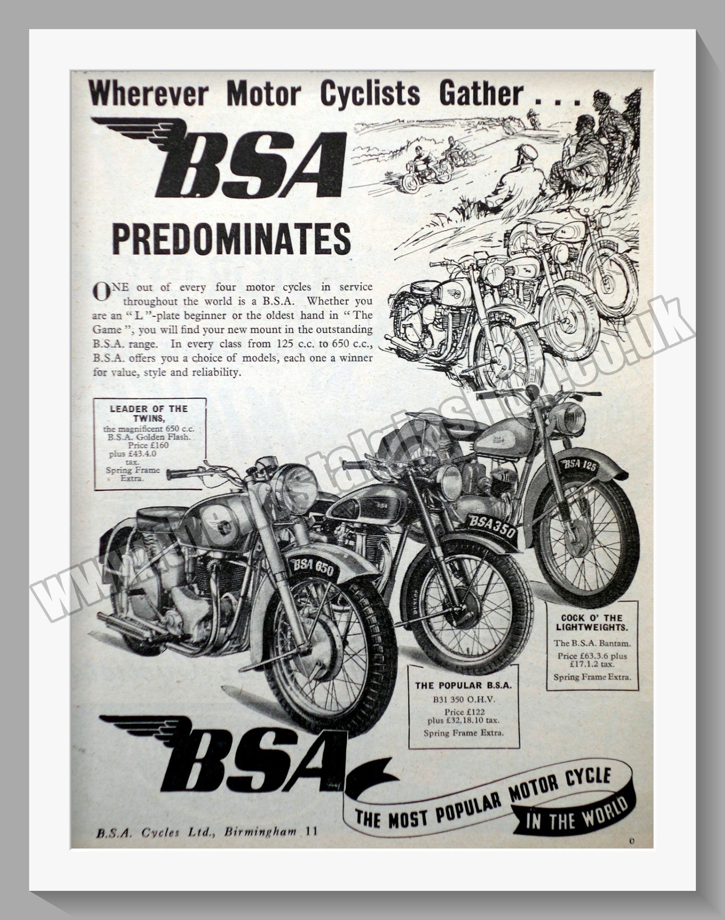 B.S.A. Motorcycle Range. Classic Original Vintage Advert 1951. Presented and Supplied in a cream bevel cut mount with backing card and Clear Bag. Ready to fit in 14 x 11 inch frame. All our adverts, unless clearly stated are Originals from the date shown They make excellent pieces of wall art and stunning gifts. Many are rare and hard to find and once sold, may not be replaced. Remember you are buying a piece of history. Website watermark is not on original. BSA Motor Cycles. Vintage Motorbike Adverts.
