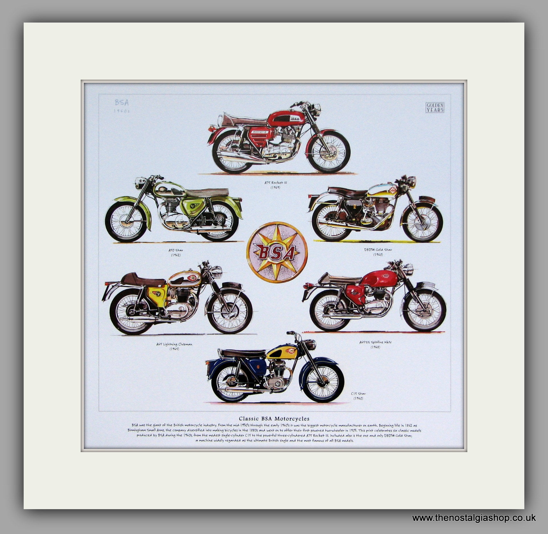 BSA Motorcycles 1960's. Bikes shown; A75 Rocket III, A50 Star, DBD34 Gold Star, A65 Lightning Clubman, A65SS Spitfire Mk IV, C15 Star. Presented in cream bevel cut mount with backing board and clear bag. The perfect gift. Size of the mount is 14.5 by 14.5 inches square, it is ready to drop straight in to a frame. Beautifully illustrated prints. Prints will be well packed, postage discounts apply to multiple purchases. Website watermarks are not present on the prints.