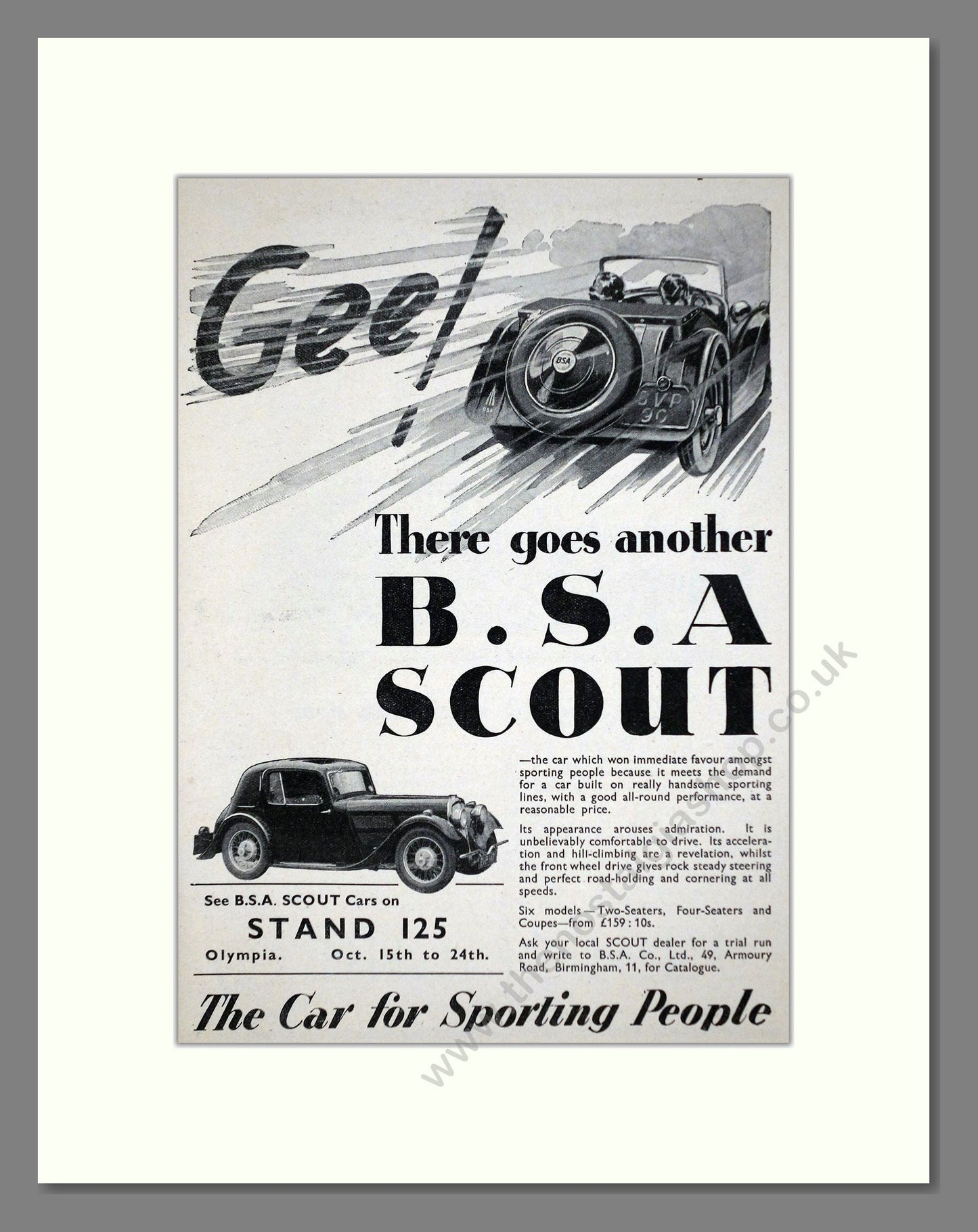 BSA - Scout. Vintage Advert. This is a classic original advert from 1936. Presented and supplied in a cream bevel cut mount with backing card and clear bag. Ready to fit in a 14 x 11 inches frame. The mounted advert will be posted via courier and well packed - protected with a sheet of hardboard to keep it rigid. Any questions or enquiries, please get in touch, we are here to help! All our adverts, unless clearly stated are originals from the date shown. They make excellent pieces of wall art and stunning gifts. Many are rare and hard to find and once sold, may not be replaced. Remember you are buying a piece of history. Website watermark is not on original.