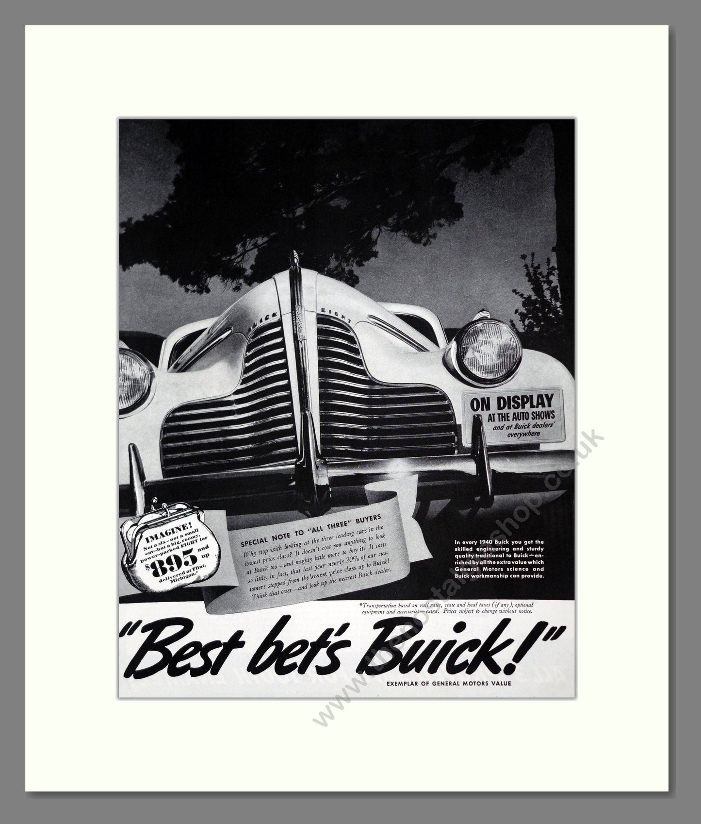 Buick - Best Bet's Buick. Vintage Advert. This is a large classic original advert from 1939. Presented and supplied in a cream bevel cut mount with backing card and clear bag. Ready to fit in a 18 x 14 inches frame. The mounted advert will be posted via courier and well packed - protected with a sheet of hardboard to keep it rigid. Any questions or enquiries, please get in touch, we are here to help! All our adverts, unless clearly stated are originals from the date shown. They make excellent pieces of wall art and stunning gifts. Many are rare and hard to find and once sold, may not be replaced. Remember you are buying a piece of history. Website watermark is not on original.