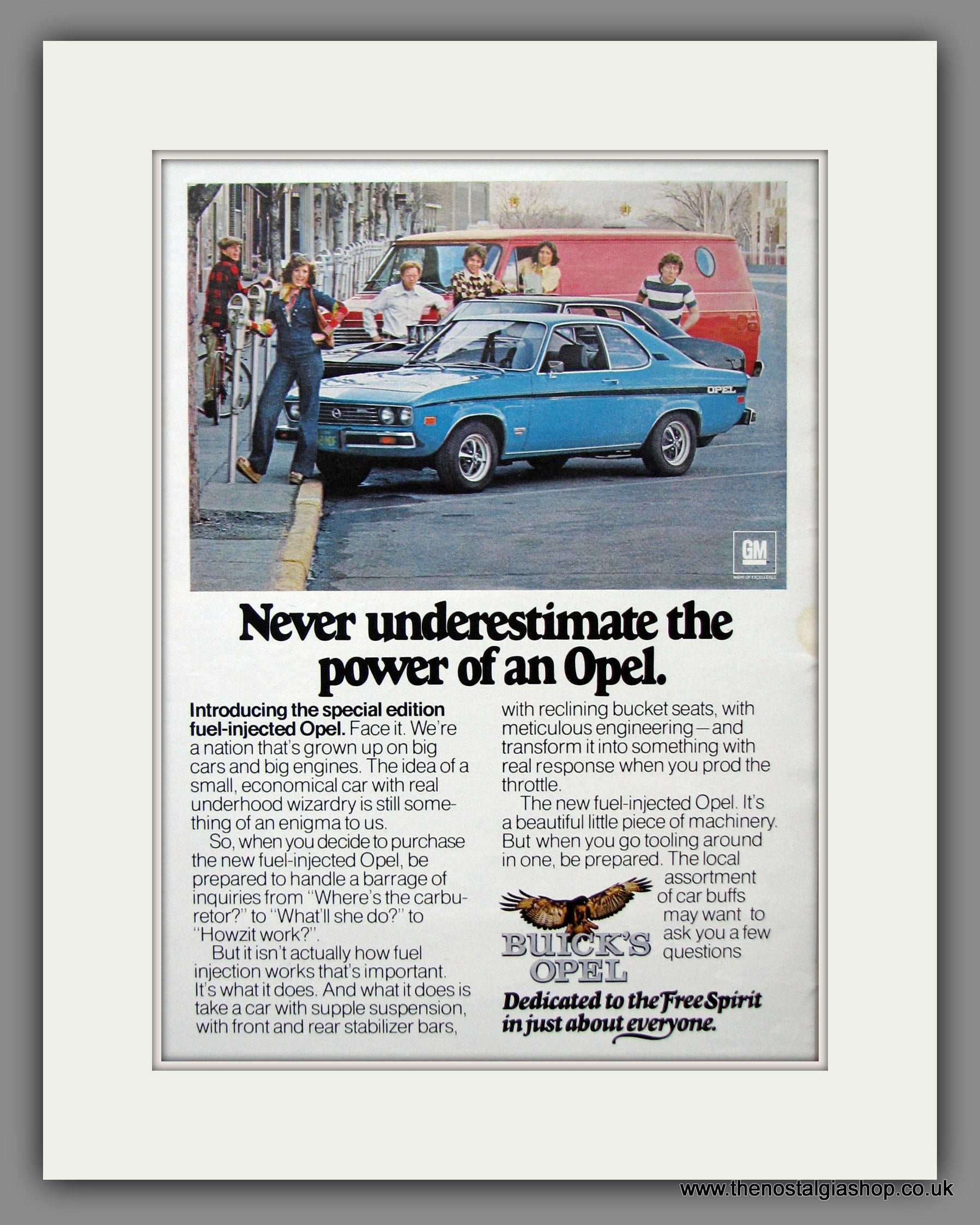 Buick Opel. Original American Advert 1975. Presented and Supplied in a cream bevel cut mount with backing card and clear bag. Ready to fit in 14 x 11 inch frame. Want it framing? If so, buy this then go to Frames Available Category. Click to buy on the suitable frame and we will do the rest. All our adverts, unless clearly stated are Originals from the date shown They make excellent pieces of wall art and stunning gifts. Many are rare and hard to find and once sold, may not be replaced. Remember you are buying a piece of history. Website watermark is not on original.