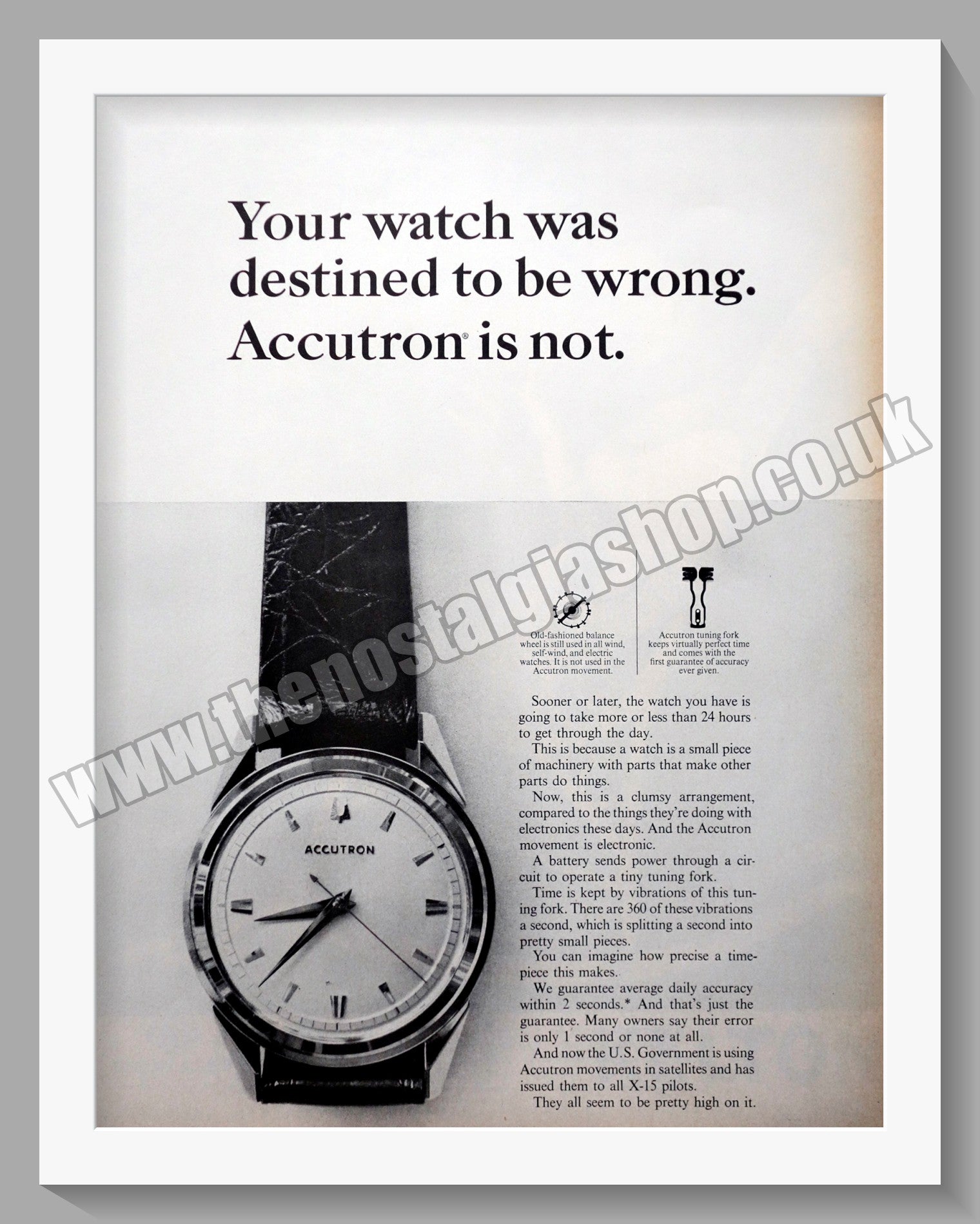 Bulova Accutron Watches. Original Vintage Advert 1964. Presented and supplied in a cream bevel cut mount with backing card and clear bag. Ready to fit in 18 x 14 inch frame. All our adverts, unless clearly stated are Originals from the date shown. They make excellent pieces of wall art and stunning gifts. Many are rare and hard to find and once sold, may not be replaced. Remember you are buying a piece of history. Website watermark is not on original.