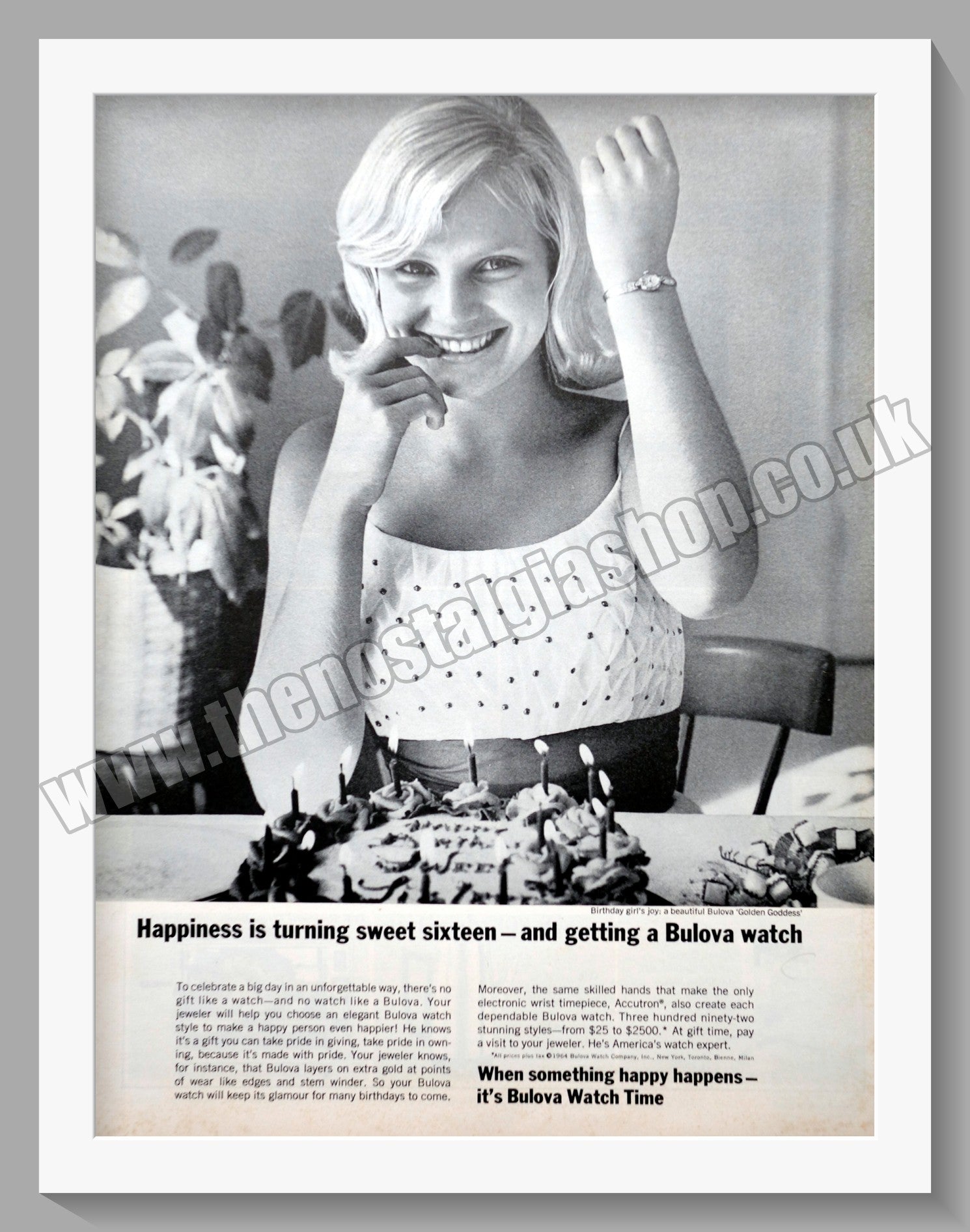 Bulova Golden Goddess Watch. Original Vintage Advert 1964. Presented and supplied in a cream bevel cut mount with backing card and clear bag. Ready to fit in 18 x 14 inch frame. All our adverts, unless clearly stated are Originals from the date shown. They make excellent pieces of wall art and stunning gifts. Many are rare and hard to find and once sold, may not be replaced. Remember you are buying a piece of history. Website watermark is not on original.