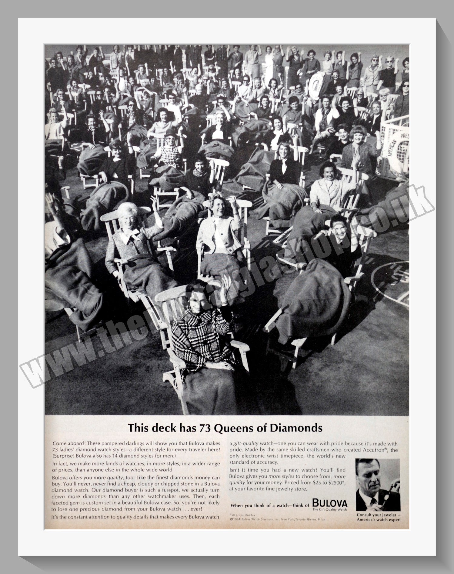 Bulova Watches. Original Vintage Advert 1964. Presented and supplied in a cream bevel cut mount with backing card and clear bag. Ready to fit in 18 x 14 inch frame. All our adverts, unless clearly stated are Originals from the date shown. They make excellent pieces of wall art and stunning gifts. Many are rare and hard to find and once sold, may not be replaced. Remember you are buying a piece of history. Website watermark is not on original.