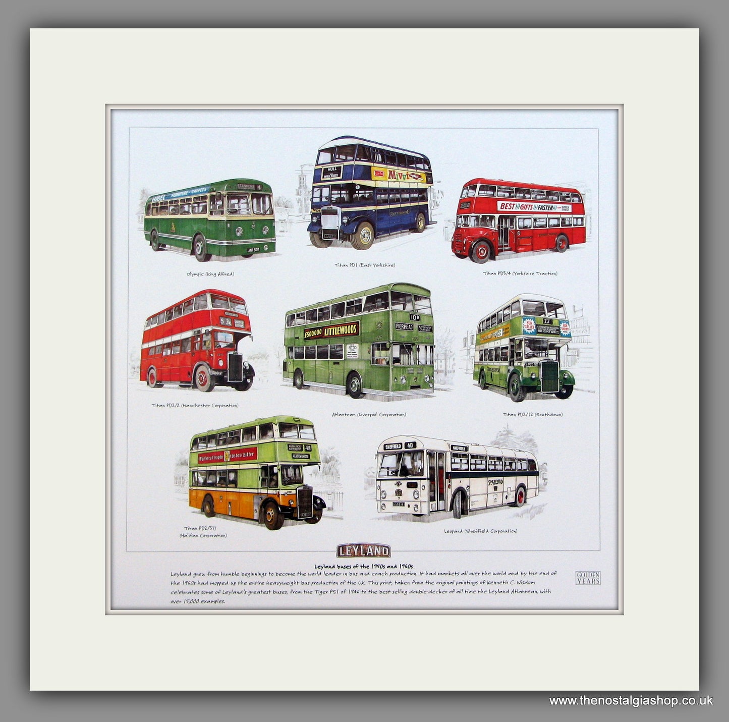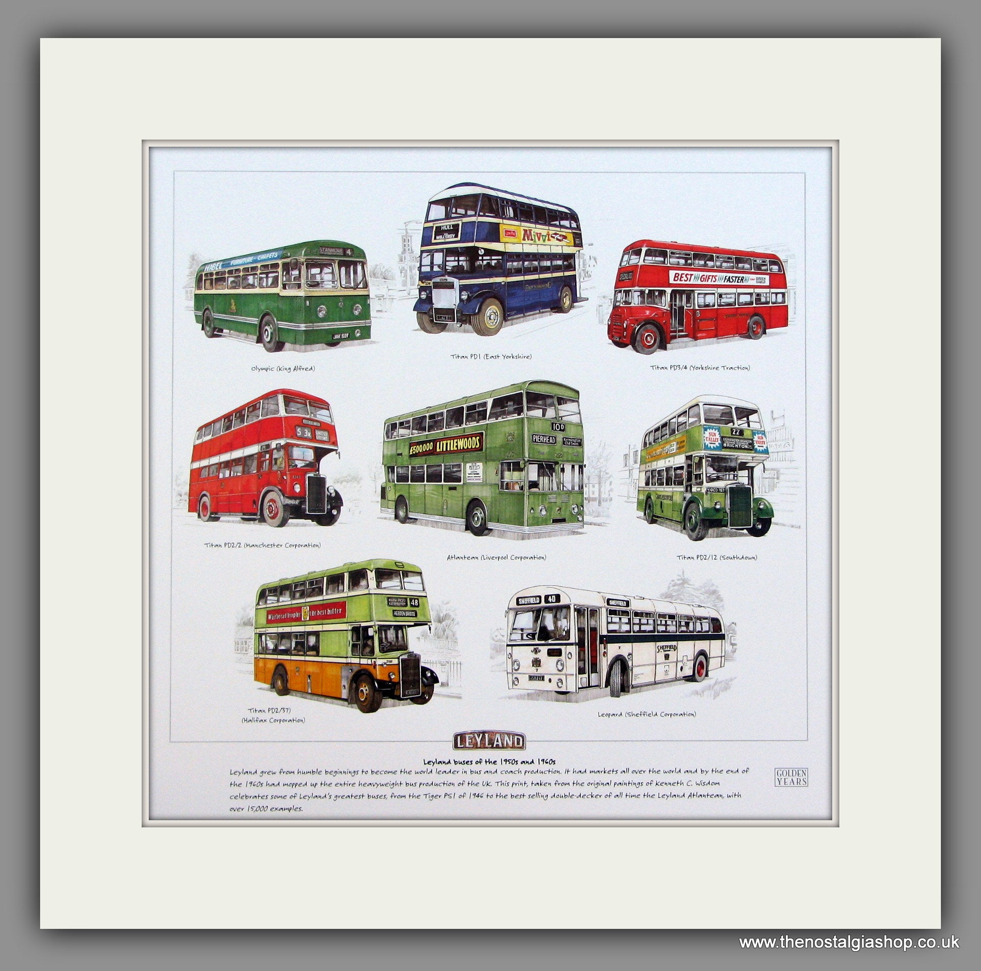 Leyland Buses of the 1950s & 1960s mounted print. Buses shown are : Olympic, Titan PD1, Titan PD 3/4, Titan PD /2, Atlantean, Titan PD2/12, Titan PD2/37, Leopard. Presented in bevel cut mount with backing board. Size of mount is 14.5 inches square. The perfect gift.