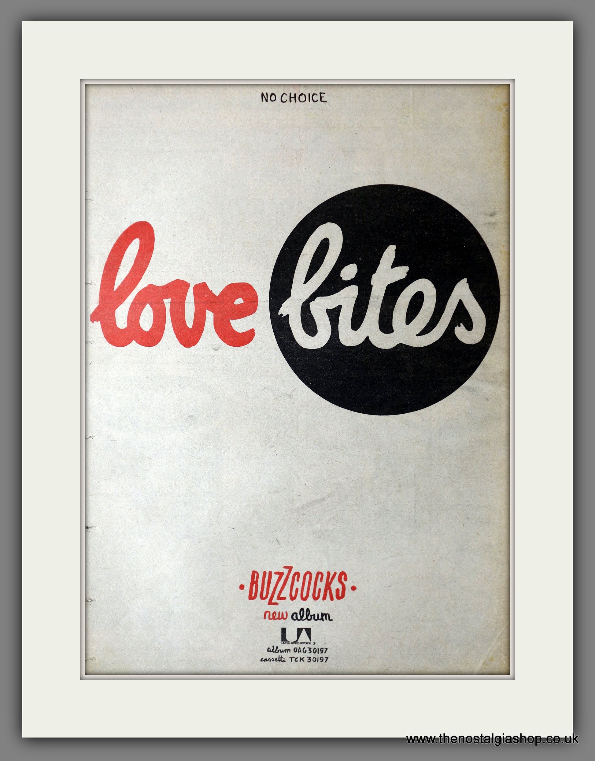 Buzzcocks. Love Bites. Vintage Advert. This is a large classic Original advert 1979. Presented and Supplied in a cream bevel cut mount with backing card and clear bag. Ready to fit in 20 x 16 inch frame. The mounted advert will be posted via courier and well packed - protected with a sheet of hardboard to keep it rigid. Any questions or inquiries, please get in touch, we are here to help! All our adverts, unless clearly stated are Originals from the date shown. They make excellent pieces of wall art and stunning gifts. Many are rare and hard to find and once sold, may not be replaced. Remember you are buying a piece of history.