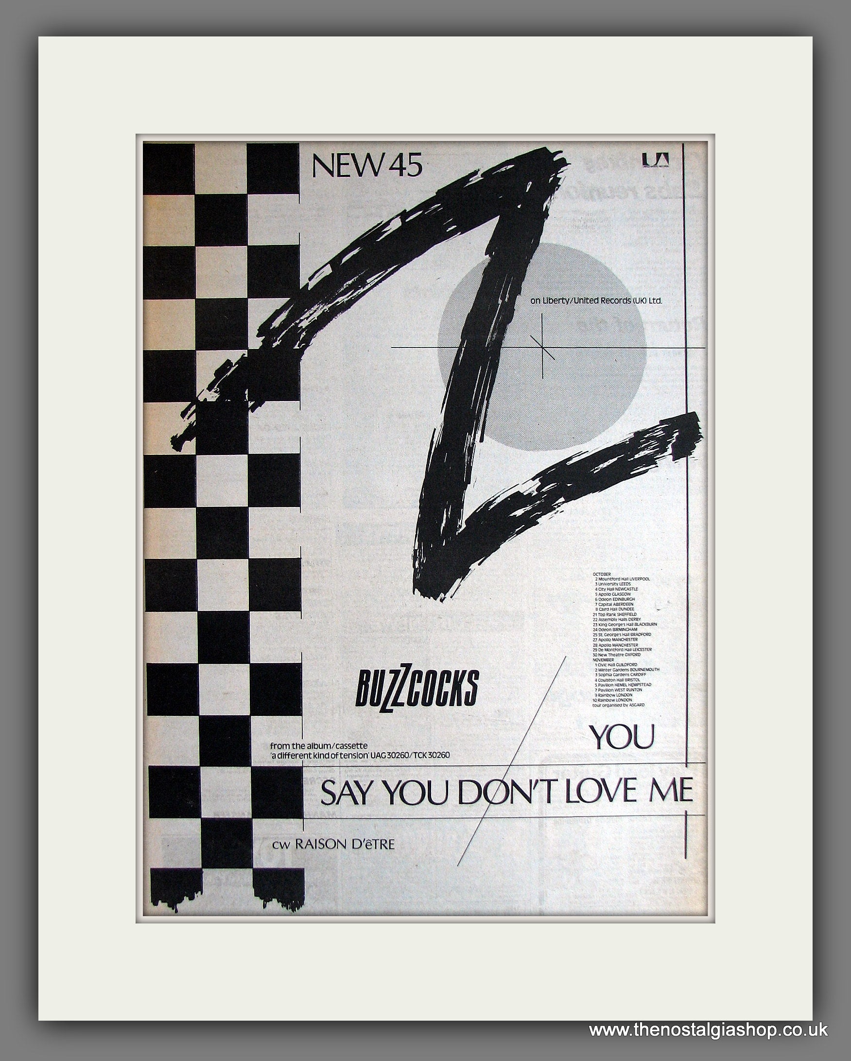 Buzzcocks You Say You Don't Love Me. Vintage Advert. This is a large classic Original advert 1979. Presented and Supplied in a cream bevel cut mount with backing card and clear bag. Ready to fit in 20 x 16 inch frame. The mounted advert will be posted via courier and well packed - protected with a sheet of hardboard to keep it rigid. Any questions or inquiries, please get in touch, we are here to help! All our adverts, unless clearly stated are Originals from the date shown. They make excellent pieces of wall art and stunning gifts. Many are rare and hard to find and once sold, may not be replaced. Remember you are buying a piece of history.