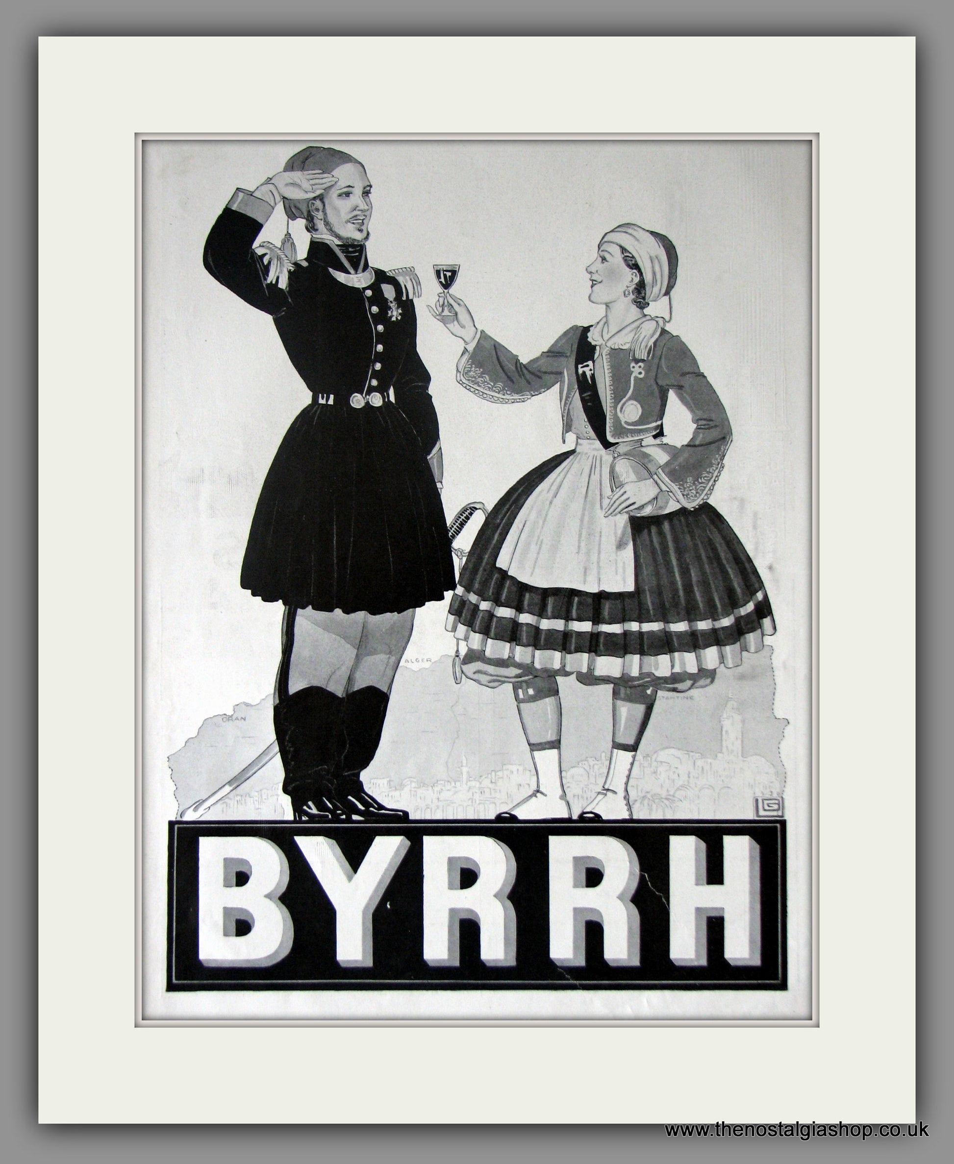 Byrrh. Vintage Advert. This is a large classic Original French advert 1930. Presented and Supplied in a cream bevel cut mount with backing card and clear bag. Ready to fit in 20 x 16 inch frame. The mounted advert will be posted via courier and well packed - protected with a sheet of hardboard to keep it rigid. Any questions or inquiries, please get in touch, we are here to help! All our adverts, unless clearly stated are Originals from the date shown. They make excellent pieces of wall art and stunning gifts. Many are rare and hard to find and once sold, may not be replaced. Remember you are buying a piece of history. Website watermark is not on original. Vintage drink adverts. Drink Adverts.