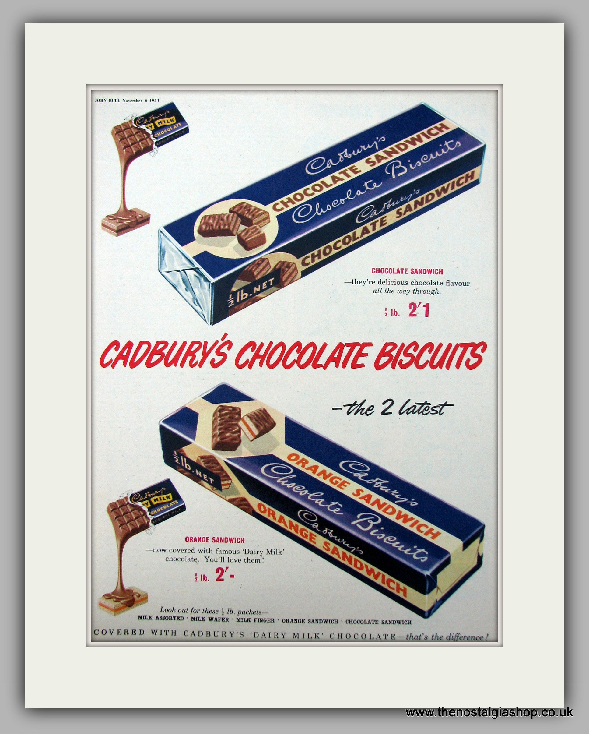 Cadburys Chocolate Biscuits. Original Advert 1954 (ref AD9949). Presented and supplied in a cream bevel cut mount with backing card and clear bag. Ready to fit in a 18 x 14 inch frame. The mounted advert will be posted via courier and well packed - protected with a sheet of hardboard to keep it rigid. Any questions or enquiries, please get in touch, we are here to help! All our adverts, unless clearly stated are originals from the date shown. They make excellent pieces of wall art and stunning gifts. Many are rare and hard to find and once sold, may not be replaced. Remember you are buying a piece of history. Website watermark is not on original.
