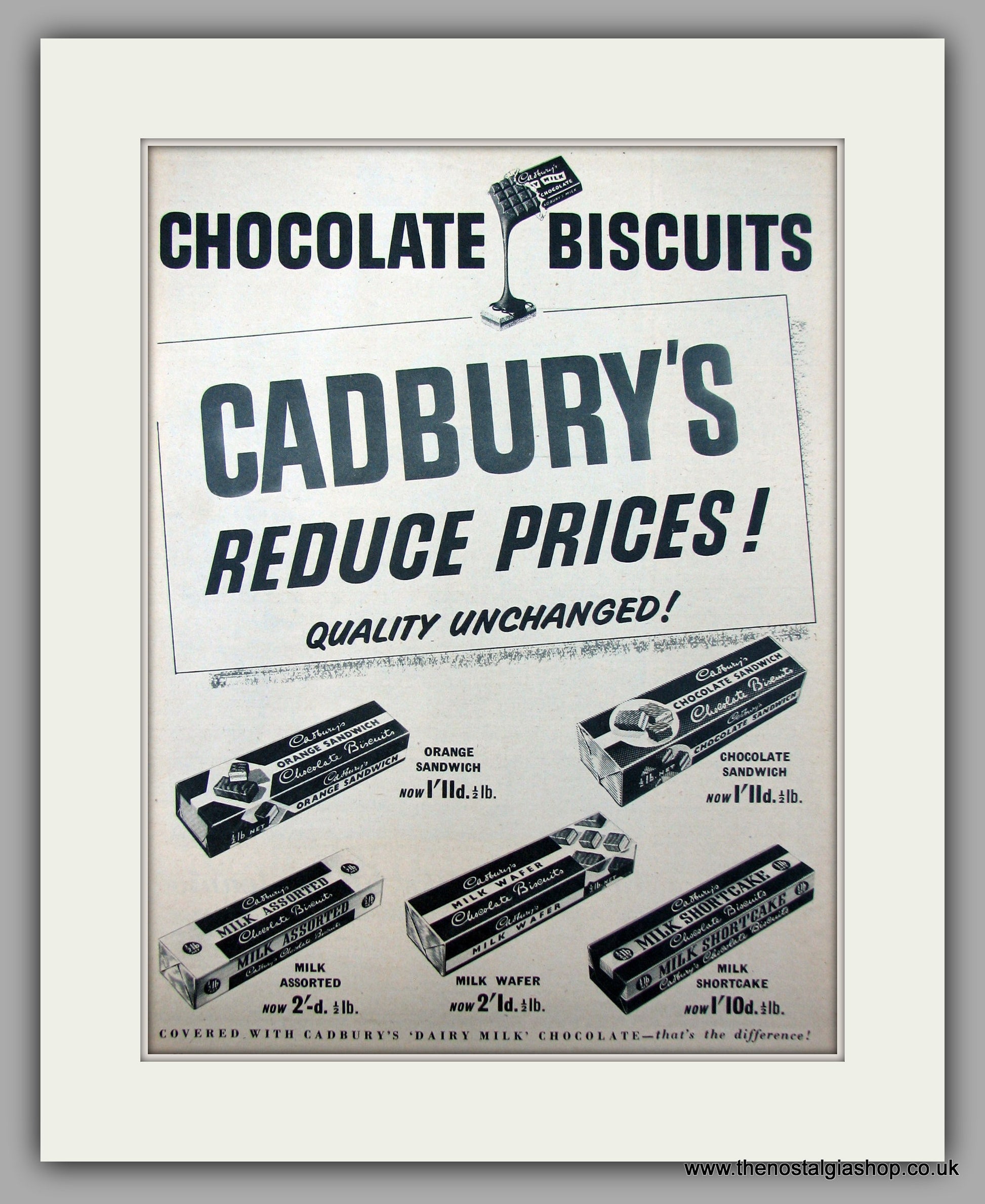 Cadburys Chocolate Biscuits. Original Advert 1955 (ref AD9944). Presented and supplied in a cream bevel cut mount with backing card and clear bag. Ready to fit in a 18 x 14 inch frame. The mounted advert will be posted via courier and well packed - protected with a sheet of hardboard to keep it rigid. Any questions or enquiries, please get in touch, we are here to help! All our adverts, unless clearly stated are originals from the date shown. They make excellent pieces of wall art and stunning gifts. Many are rare and hard to find and once sold, may not be replaced. Remember you are buying a piece of history. Website watermark is not on original.