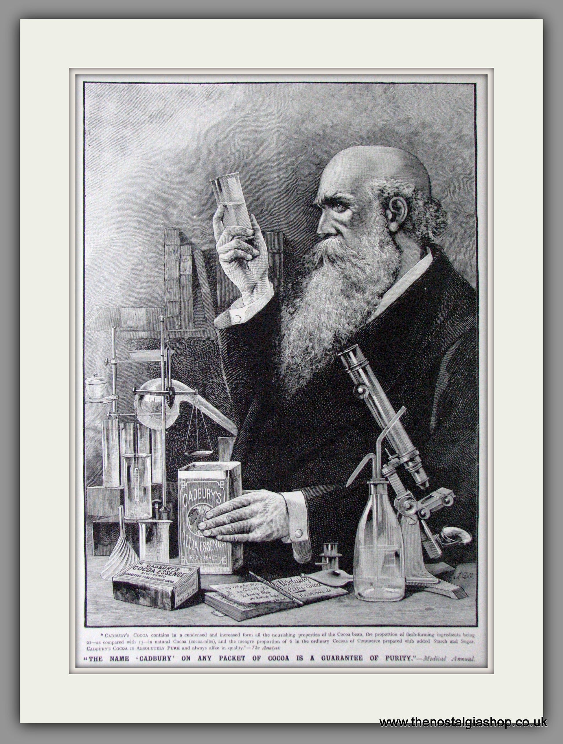 Cadbury's Cocoa. Vintage Advert. This is a large Original advert 1892. Presented in cream bevel cut mount with backing card and clear bag. Ready to fit in 20 x 16 inch frame. The mounted advert will be posted via courier and well packed - protected with a sheet of hardboard to keep it rigid. Any questions or inquiries, please get in touch, we are here to help! All our adverts, unless clearly stated are Originals from the date shown. They make excellent pieces of wall art and stunning gifts. Many are rare and hard to find and once sold, may not be replaced. Remember you are buying a piece of history. Website watermark is not on original .