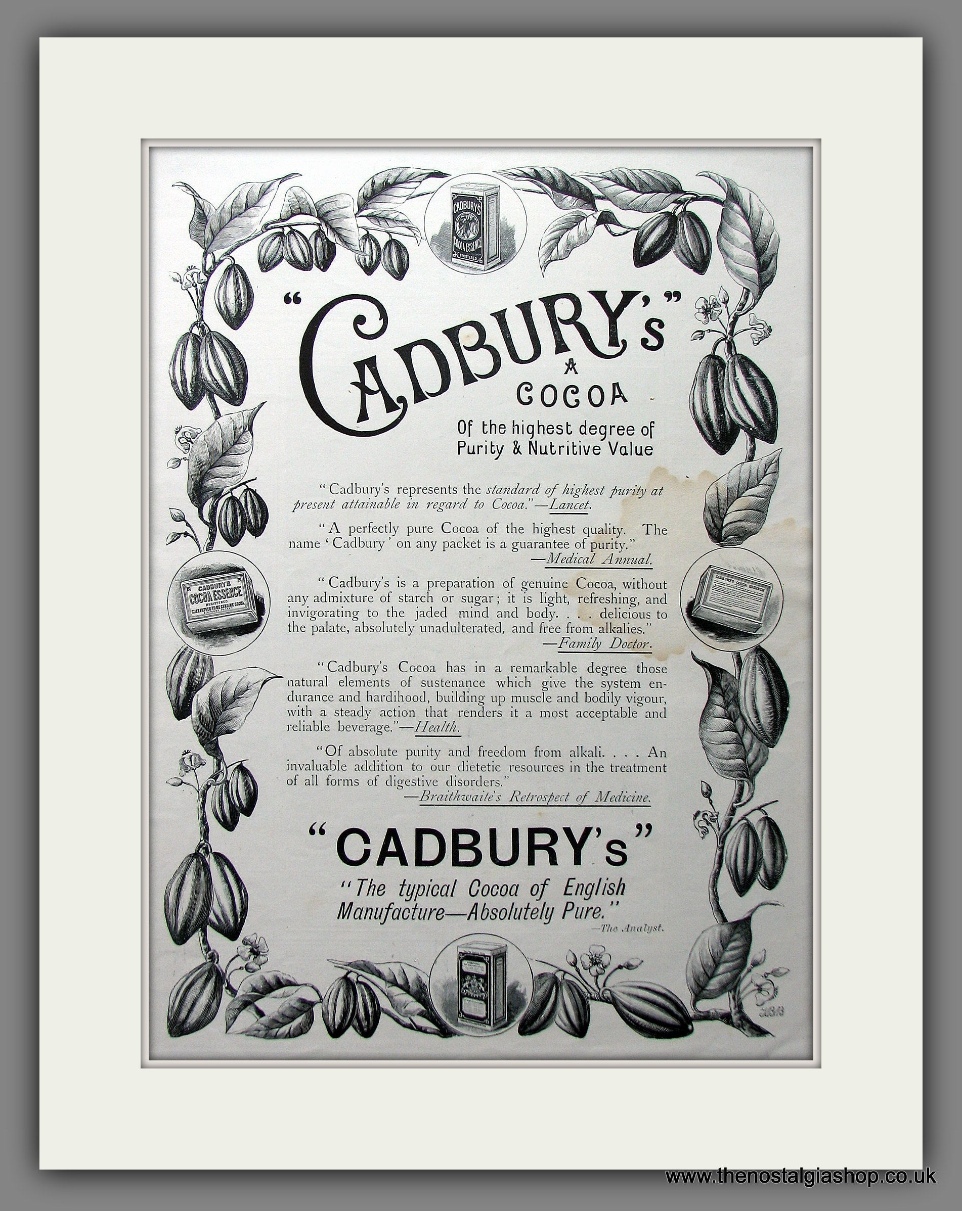 Cadbury's Cocoa. Classic Original Advert 1895. Presented and Supplied in a cream bevel cut mount with backing card and clear bag. Will be well packed with a sheet of hardboard to keep it rigid. Ready to fit in 20 x 16 inch frame. All our adverts, unless clearly stated are Originals from the date shown They make excellent pieces of wall art and stunning gifts. Many are rare and hard to find and once sold, may not be replaced. Remember you are buying a piece of history. Website watermark is not on original. Note, See photo - Light Staining on mid right of advert.