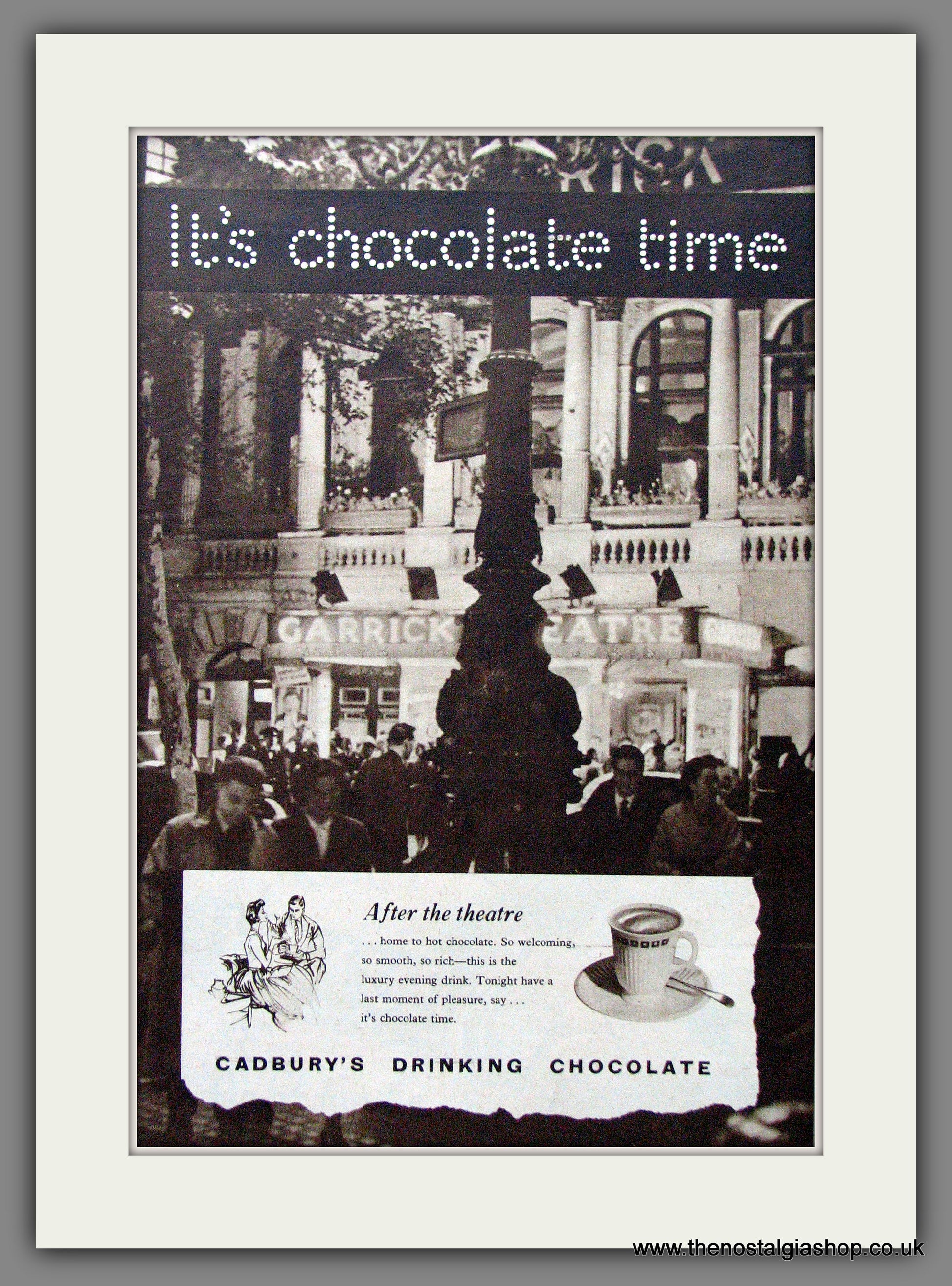 Cadbury's Drinking Chocolate. Classic original advert 1957. Presented and Supplied in a cream bevel cut mount with backing card and clear bag. Ready to fit in 14 x 11 inch frame. Want it framing? If so, buy this then go to Frames Available Category. Click to buy on the suitable frame and we will do the rest. All our adverts, unless clearly stated are Originals from the date shown They make excellent pieces of wall art and stunning gifts. Many are rare and hard to find and once sold, may not be replaced. Remember you are buying a piece of history. Website watermark is not on original.