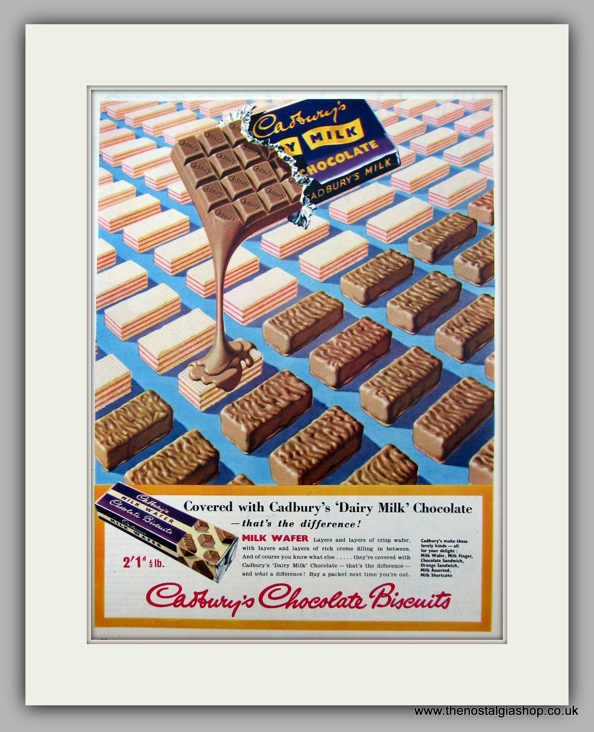 Cadburys Milk Wafer Biscuits. Original Advert 1956 (ref AD9948). Presented and supplied in a cream bevel cut mount with backing card and clear bag. Ready to fit in a 18 x 14 inch frame. The mounted advert will be posted via courier and well packed - protected with a sheet of hardboard to keep it rigid. Any questions or enquiries, please get in touch, we are here to help! All our adverts, unless clearly stated are originals from the date shown. They make excellent pieces of wall art and stunning gifts. Many are rare and hard to find and once sold, may not be replaced. Remember you are buying a piece of history. Website watermark is not on original.