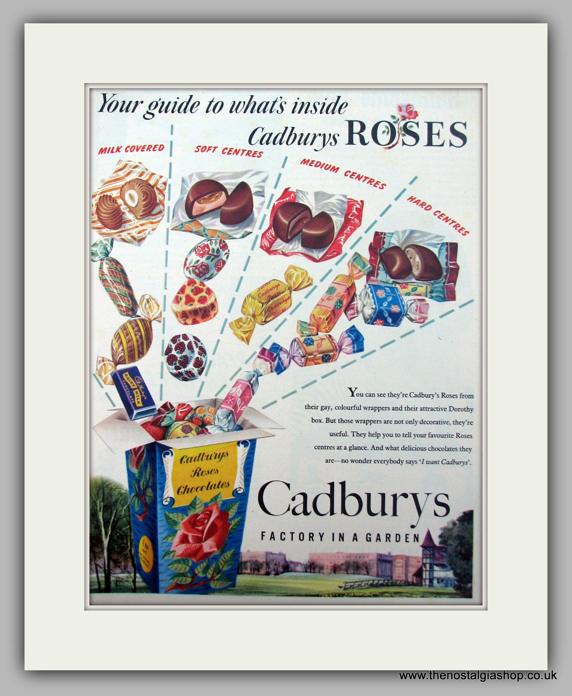 Cadburys Roses Chocolates. Original Advert 1955 (ref AD9939). Presented and supplied in a cream bevel cut mount with backing card and clear bag. Ready to fit in a 18 x 14 inch frame. The mounted advert will be posted via courier and well packed - protected with a sheet of hardboard to keep it rigid. Any questions or enquiries, please get in touch, we are here to help! All our adverts, unless clearly stated are originals from the date shown. They make excellent pieces of wall art and stunning gifts. Many are rare and hard to find and once sold, may not be replaced. Remember you are buying a piece of history. Website watermark is not on original.