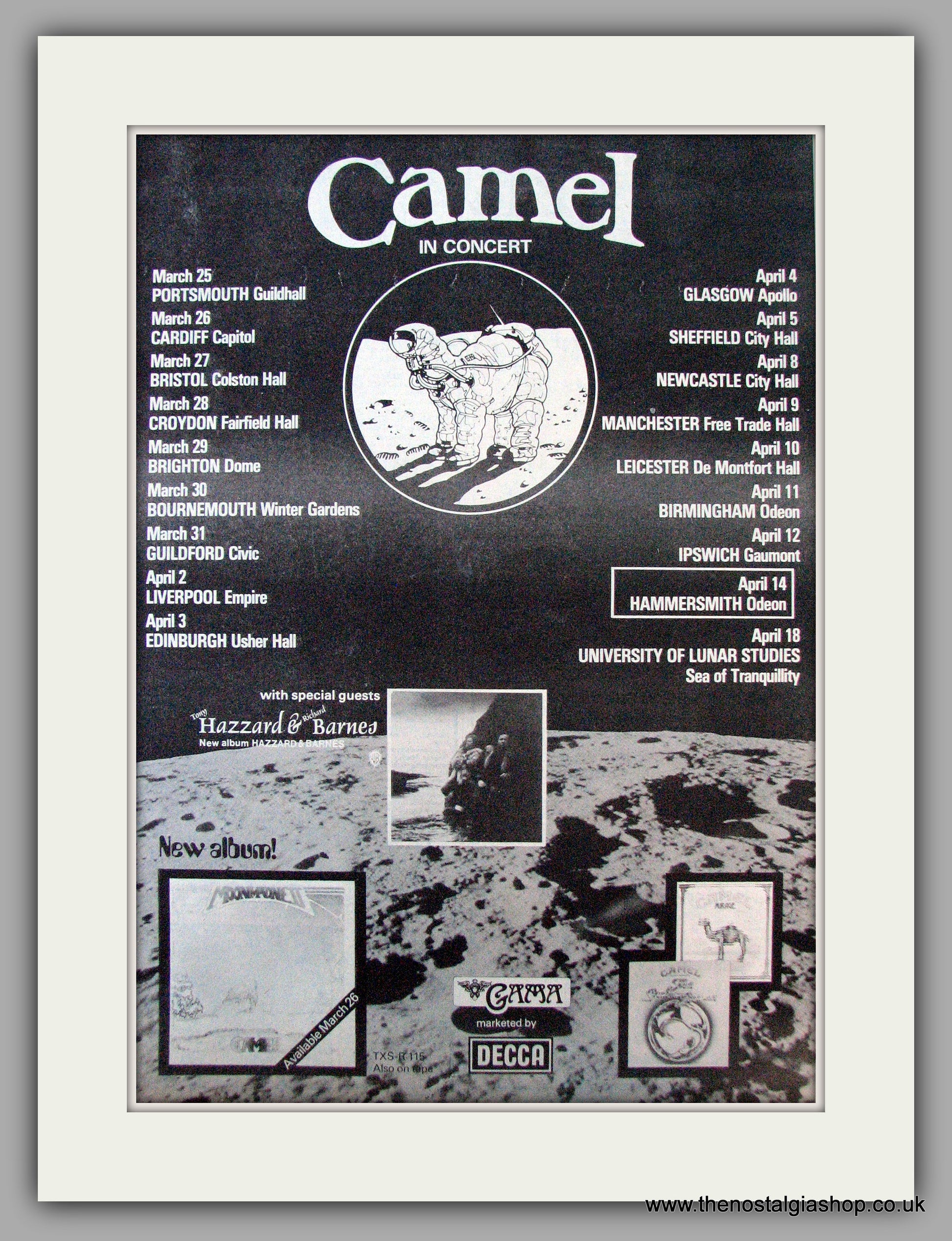 Camel In Concert. UK Tour Dates 1976. Vintage Advert 1976 (ref AD9682). Presented and supplied in a cream bevel cut mount with backing card and clear bag. Ready to fit in a 20x16 inch frame. The mounted advert will be posted via courier and well packed - protected with a sheet of hardboard to keep it rigid. Any questions or enquiries, please get in touch, we are here to help! All our adverts, unless clearly stated are originals from the date shown. They make excellent pieces of wall art and stunning gifts. Many are rare and hard to find and once sold, may not be replaced. Remember you are buying a piece of history. Website watermark is not on original.