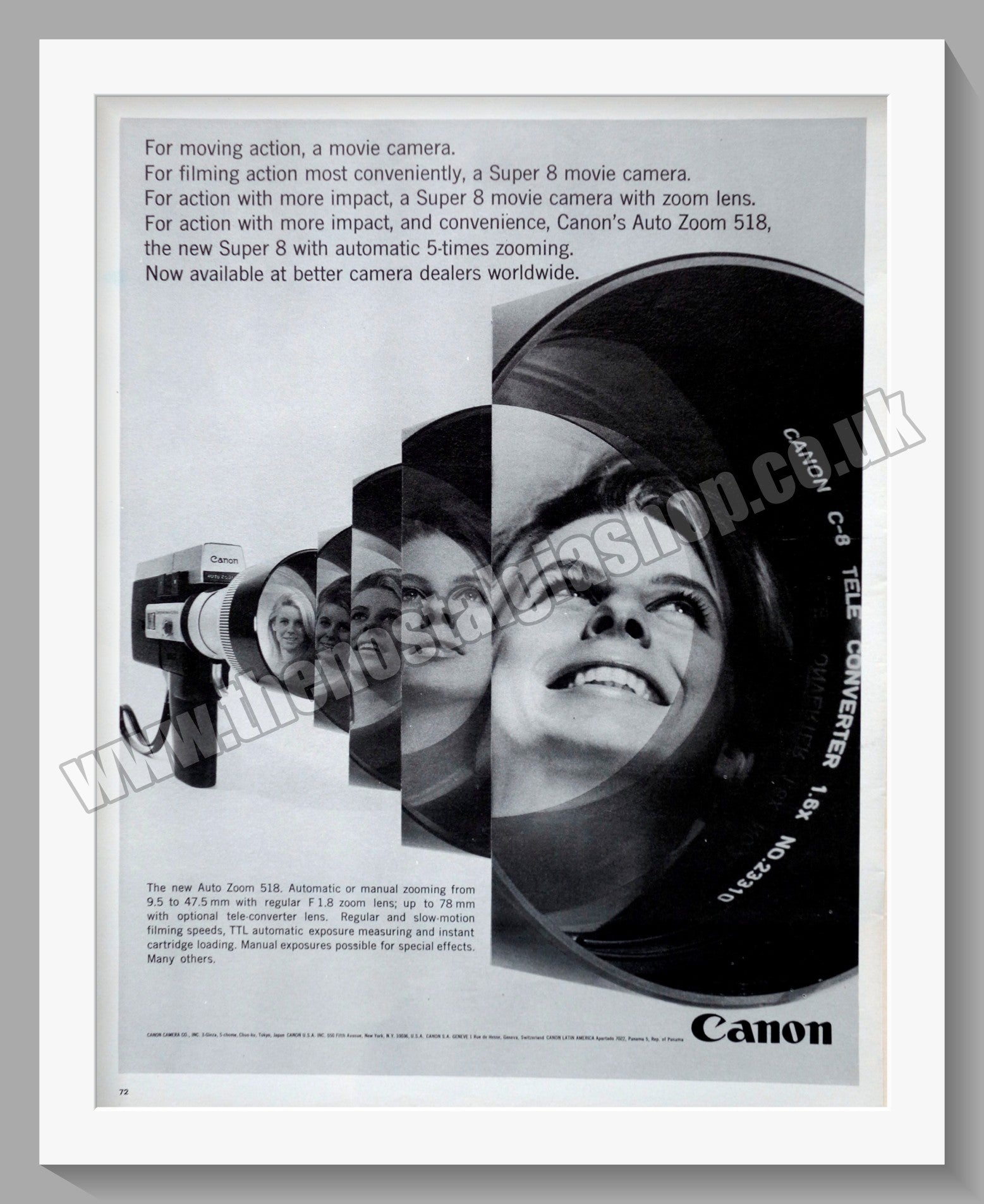Canon Auto Zoom 518 Camera. Vintage Advert. Classic Original Advert 1967. Presented and Supplied in a cream bevel cut mount with backing card and clear bag. Ready to fit in 18 x 14 inch frame. Will be well packed with a sheet of hardboard to keep the mounted Advert flat. All our adverts, unless clearly stated are Originals from the date shown. They make excellent pieces of wall art and stunning gifts. Many are rare and hard to find and once sold, may not be replaced. Remember you are buying a piece of history. Website watermark is not on original. Vintage Cameras, Old Cameras.