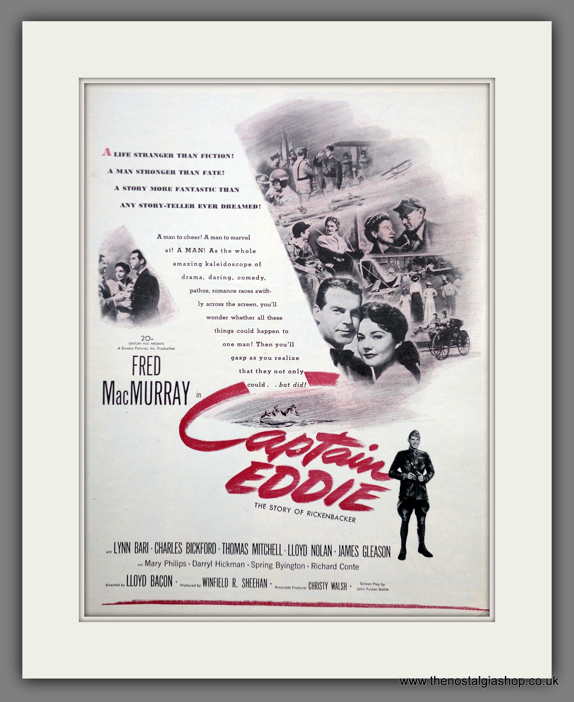 Captain Eddie. Fred MacMurray. Classic Original Advert 1945. Presented in cream bevel cut mount with backing card. Ready to fit in 18 x 14 inch frame. All our adverts, unless clearly stated are Originals from the date shown They make excellent pieces of wall art and stunning gifts. Many are rare and hard to find and once sold, may not be replaced. Remember you are buying a piece of history. Website watermark is not on original.