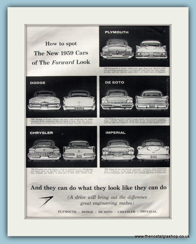 Car Range of 1959. How to spot the new 1959 cars of the forward look. Classic original advert 1959. Presented in a 20 x 16 Inch cream mount with backing board and clear bag. Ready to Frame. All our adverts, unless clearly stated are Originals from the date shown. They make excellent pieces of wall art and stunning gifts. Many are rare and hard to find and once sold, may not be replaced. Remember you are buying a piece of history. Website watermarks are not on original. Adverts will be well packed with hardboard to keep rigid in the post.