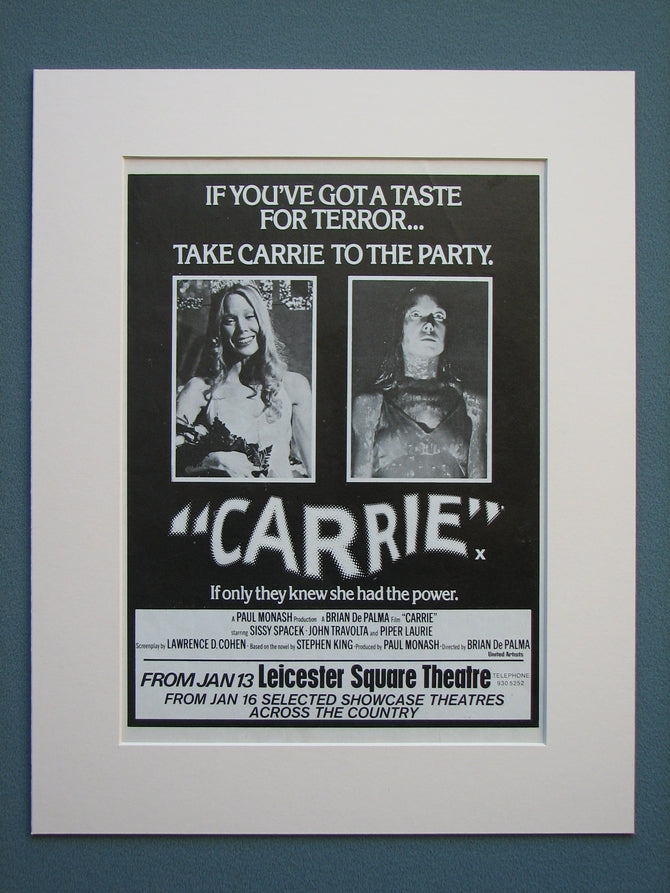 Carrie. Sissy Spacek, John Travolta, Piper Laurie. Original advert 1977. Presented in cream bevel cut mount with backing card. Ready to fit in 14 x 11 inch frame. Want it framing? buy this then go to Frames Available Category. Click to buy on the suitable frame and we will do the rest. All our adverts, unless clearly stated are Originals from the date shown They make excellent pieces of wall art and stunning gifts. Many are rare and hard to find and once sold, may not be replaced. Remember you are buying a piece of history.