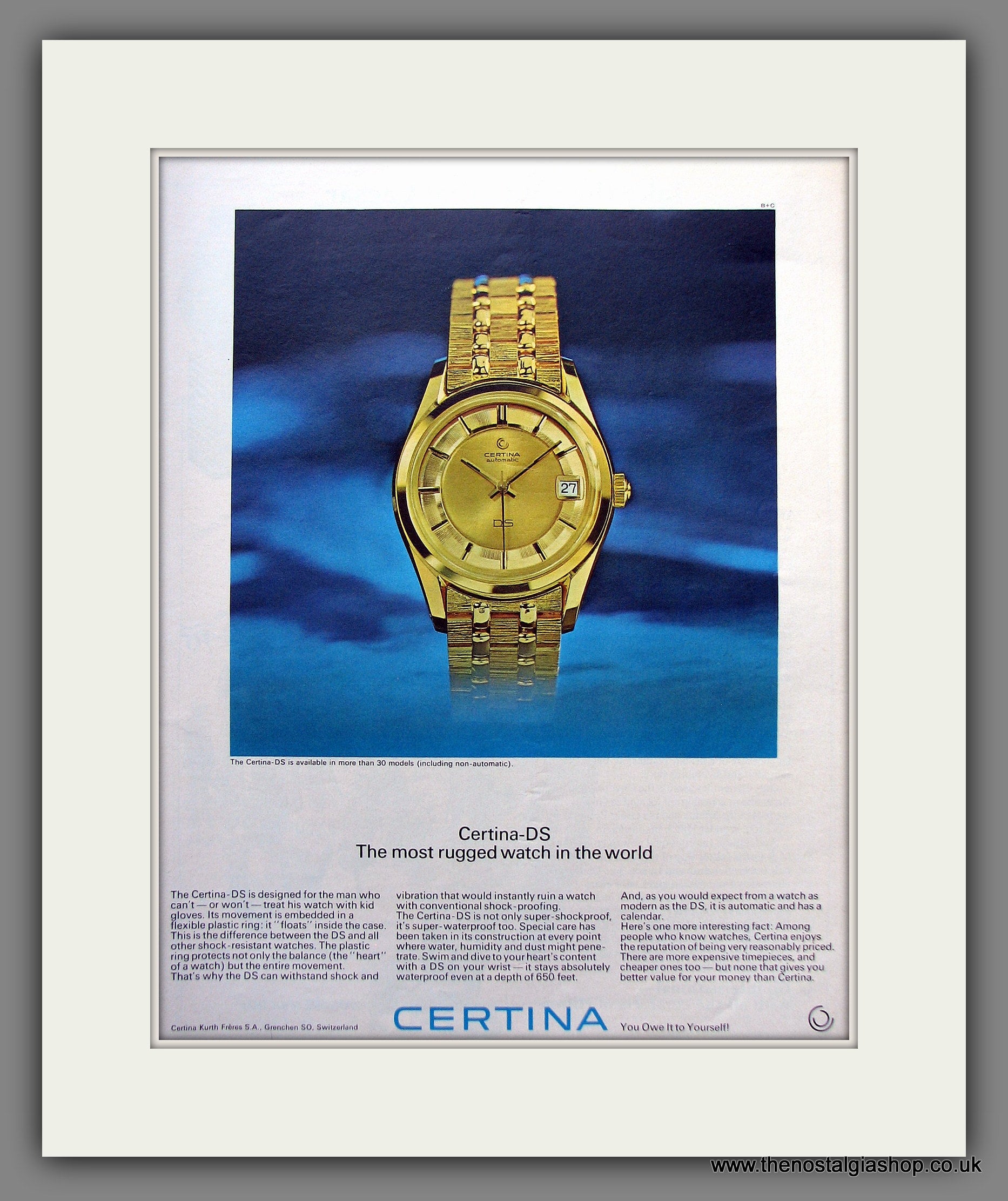 Certina. DS. This is a large classic Original advert 1966. Presented in cream bevel cut mount with backing card and clear bag. Ready to fit in 18 x 14 inch frame. The mounted advert will be posted via courier and well packed - protected with a sheet of hardboard to keep it rigid. Any questions or enquiries, please get in touch, we are here to help! All our adverts, unless clearly stated are Originals from the date shown. They make excellent pieces of wall art and stunning gifts. Many are rare and hard to find and once sold, may not be replaced. Remember you are buying a piece of history. Website watermark is not on original .