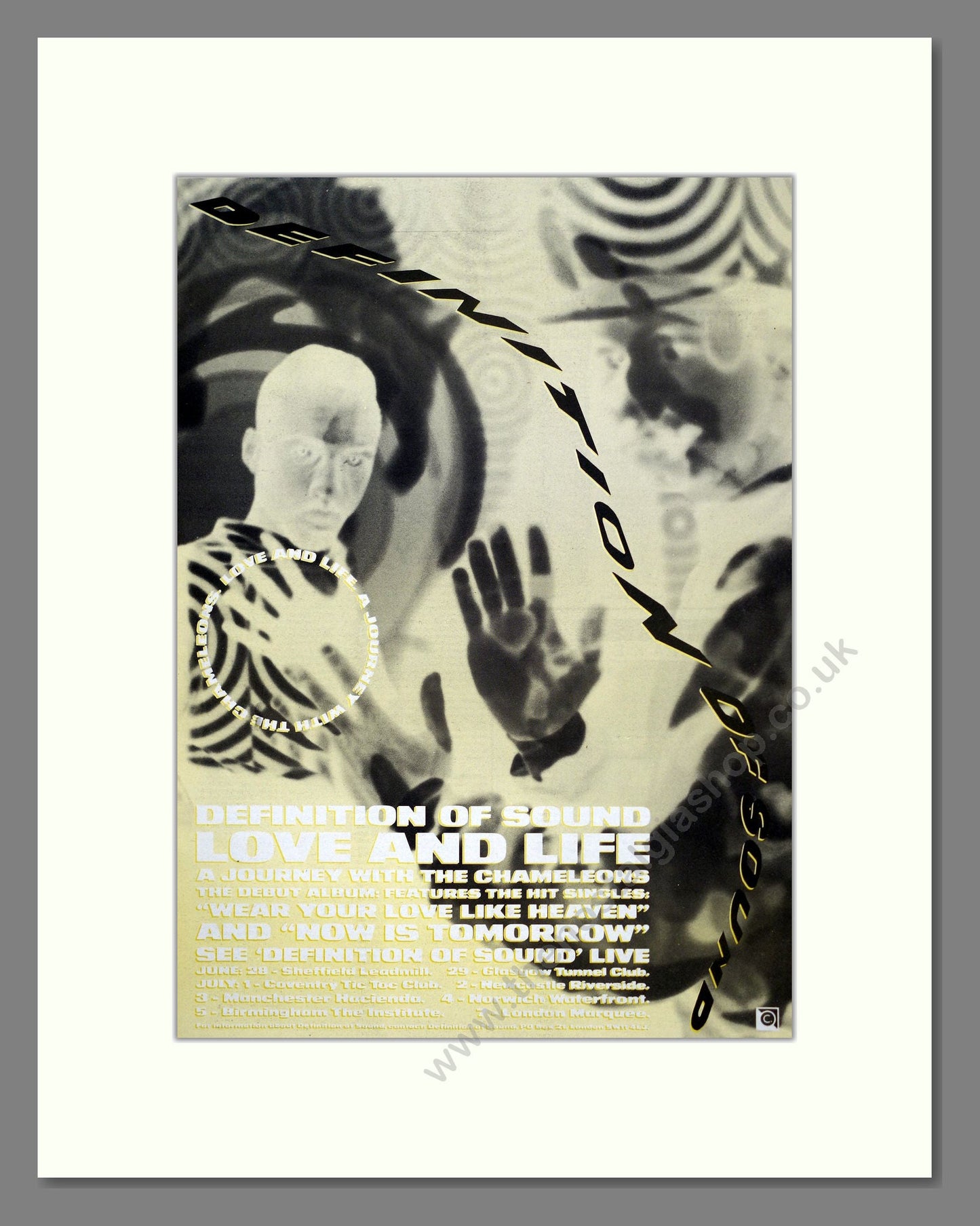 Chameleons (The) - Definition Of Sound. Vintage Advert. This is a large classic original advert from 1991. Presented and supplied in a cream bevel cut mount with backing card and clear bag. Ready to fit in a 20 x 16 inches frame. The mounted advert will be posted via courier and well packed - protected with a sheet of hardboard to keep it rigid. Any questions or enquiries, please get in touch, we are here to help! All our adverts, unless clearly stated are originals from the date shown. They make excellent pieces of wall art and stunning gifts. Many are rare and hard to find and once sold, may not be replaced. Remember you are buying a piece of history. Website watermark is not on original.