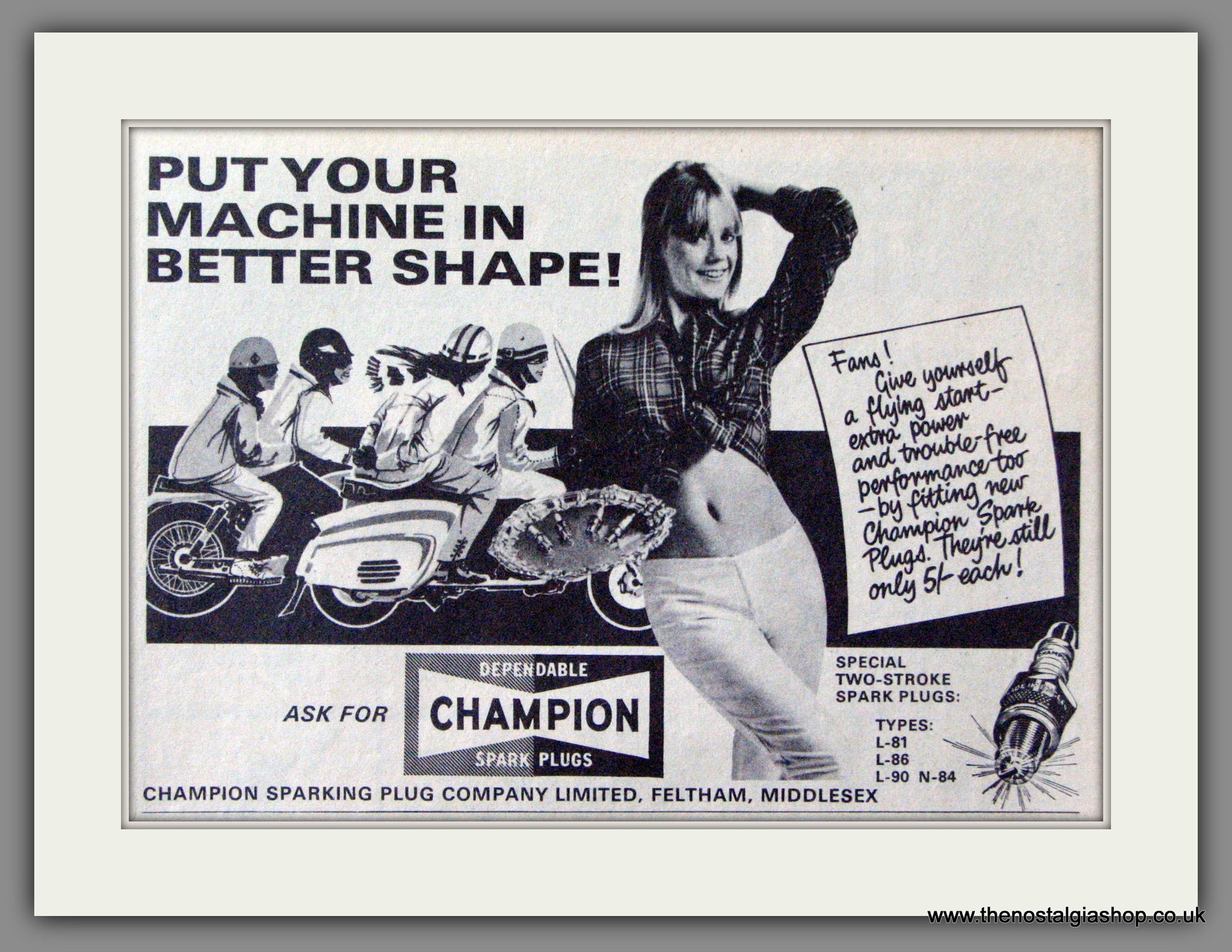 Champion Spark Plugs. Scooter Accessories. Vintage Original Advert from 1966. Presented and Supplied in cream bevel cut mount with backing board and clear bag. Made to fit straight into 12 by 10 inch frame. All our Adverts, unless clearly stated are Original and from the year stated. They are NOT modern reprints. Many are difficult to get hold of , some are very rare and once sold may not be replaced, Remember, you are buying a piece of historic nostalgia. Lots more adverts available. Please contact us if you don't see the advert you want. Scooters. Mods.