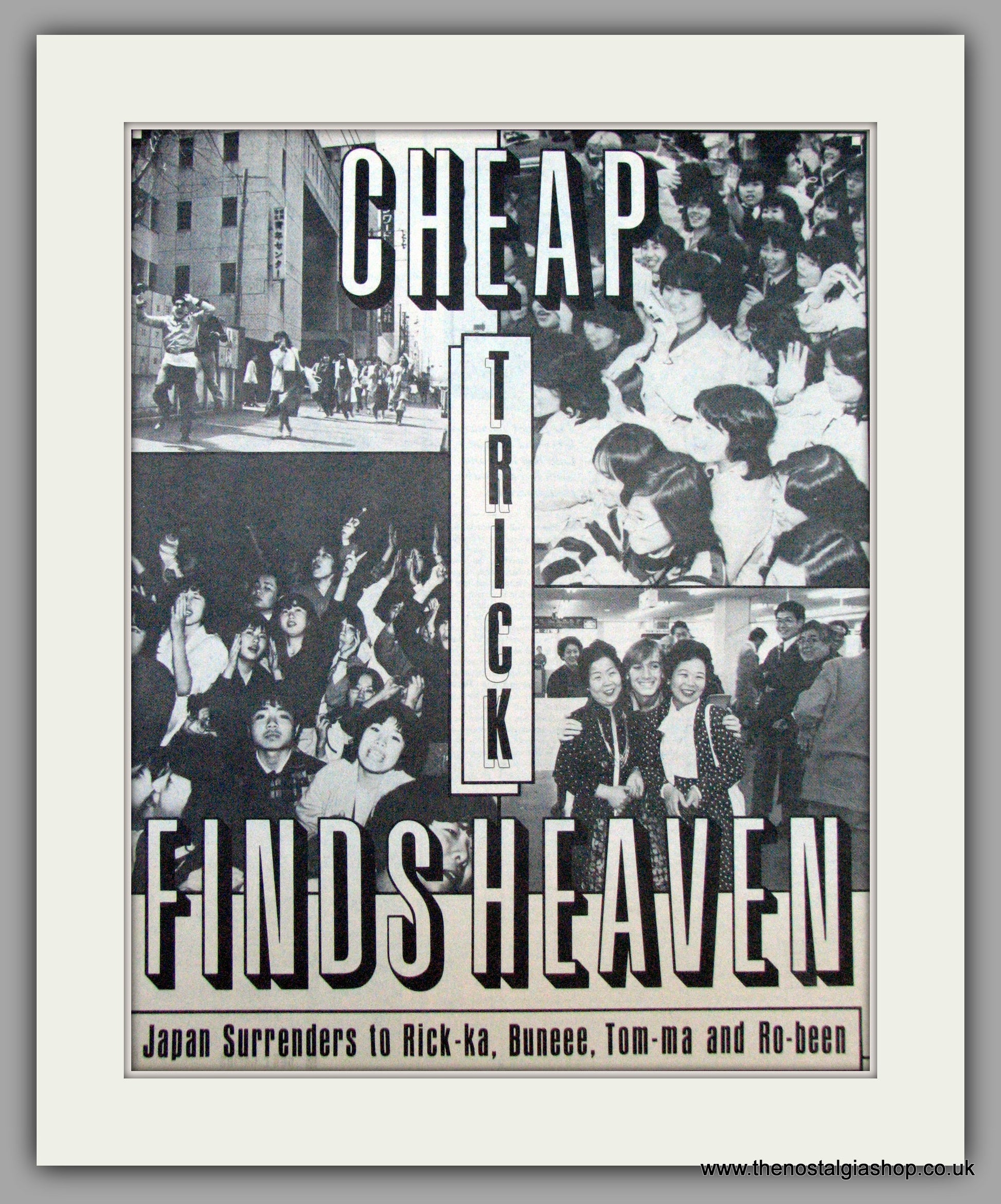 Cheap Trick in Japan. Original Advert 1979 (ref AD9475). Presented and supplied in a cream bevel cut mount with backing card and clear bag. Ready to fit in a 20x16 inch frame. The mounted advert will be posted via courier and well packed - protected with a sheet of hardboard to keep it rigid. Any questions or enquiries, please get in touch, we are here to help! All our adverts, unless clearly stated are originals from the date shown. They make excellent pieces of wall art and stunning gifts. Many are rare and hard to find and once sold, may not be replaced. Remember you are buying a piece of history. Website watermark is not on original.