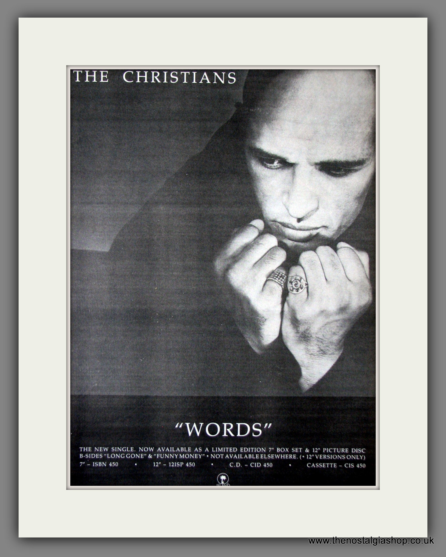 Christians (The) Words. Original Advert 1989 (ref AD11877). Presented and supplied in a cream bevel cut mount with backing card and clear bag. Ready to fit in a 20x16 inch frame. The mounted advert will be posted via courier and well packed - protected with a sheet of hardboard to keep it rigid. Any questions or enquiries, please get in touch, we are here to help! All our adverts, unless clearly stated are originals from the date shown. They make excellent pieces of wall art and stunning gifts. Many are rare and hard to find and once sold, may not be replaced. Remember you are buying a piece of history. Website watermark is not on original.