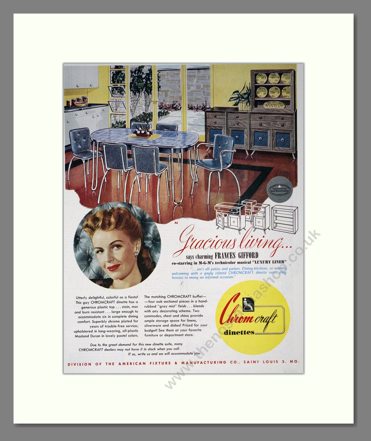 Chromcraft - Kitchen Furniture. Vintage Advert. This is a large classic original advert from 1948. Presented and supplied in a cream bevel cut mount with backing card and clear bag. Ready to fit in a 18 x 14 inches frame. The mounted advert will be posted via courier and well packed - protected with a sheet of hardboard to keep it rigid. Any questions or enquiries, please get in touch, we are here to help! All our adverts, unless clearly stated are originals from the date shown. They make excellent pieces of wall art and stunning gifts. Many are rare and hard to find and once sold, may not be replaced. Remember you are buying a piece of history. Website watermark is not on original.