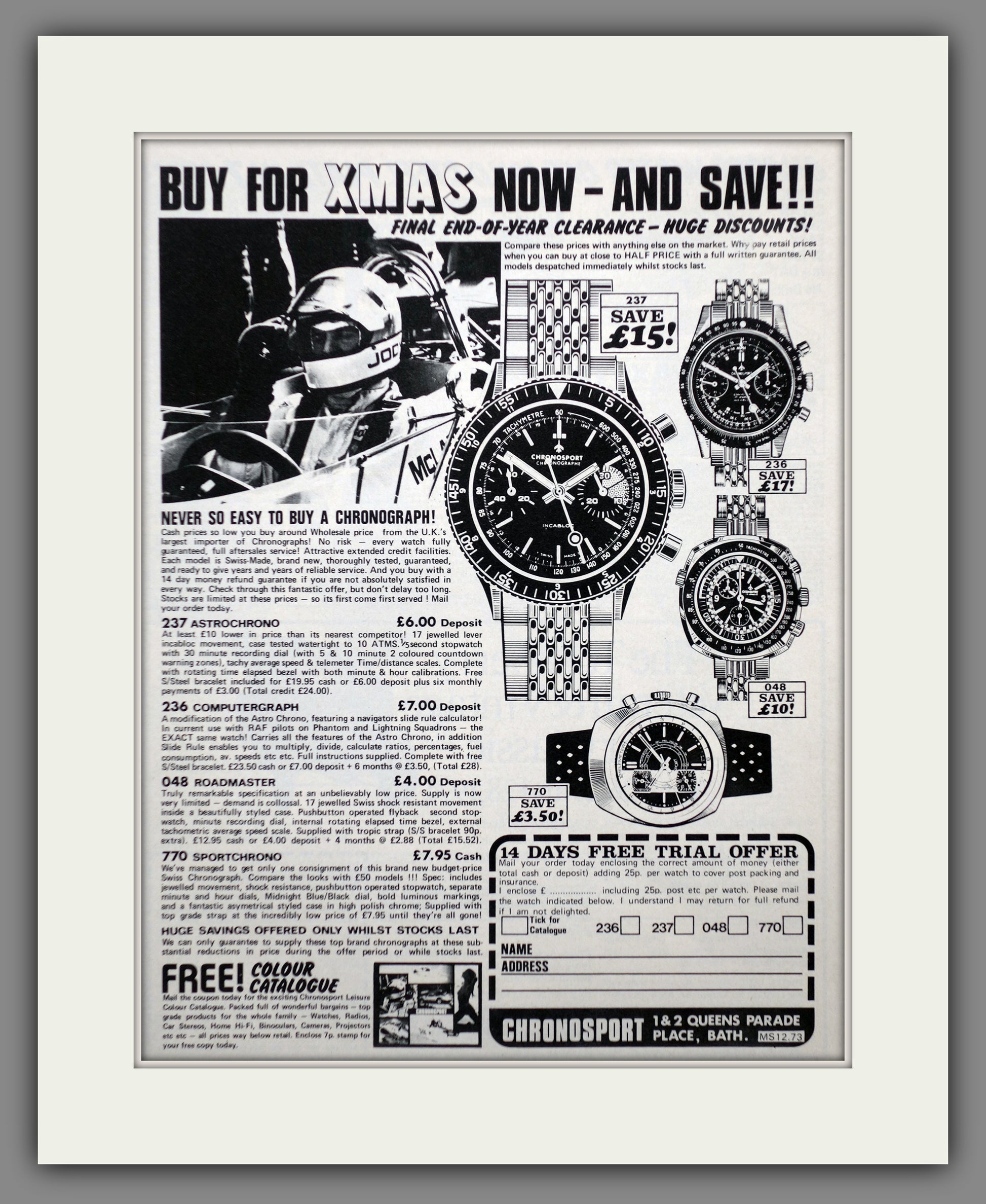 Chronosport watches. Vintage Advert. Classic Original Advert 1973. Presented in cream bevel cut mount with backing card and clear bag. Ready to fit in 14 x 11 inch frame. All our adverts, unless clearly stated are Originals from the date shown. They make excellent pieces of wall art and stunning gifts. Many are rare and hard to find and once sold, may not be replaced. Remember you are buying a piece of history. Website watermark is not on original.