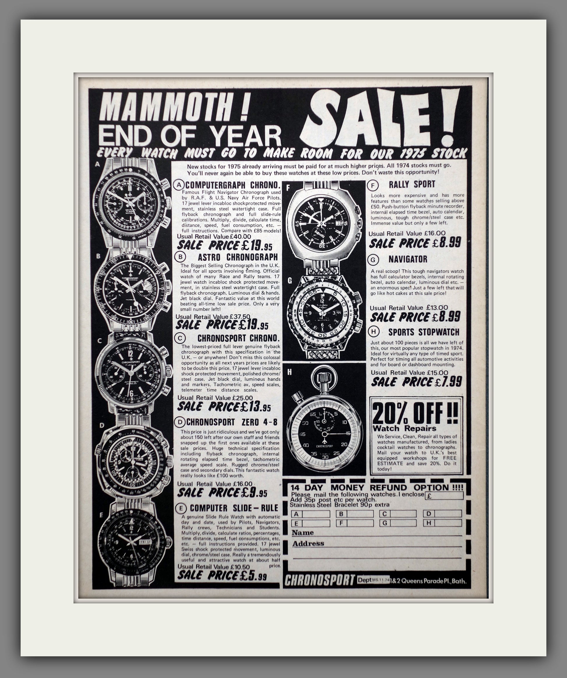 Chronosport watches. Vintage Advert. Classic Original Advert 1974. Presented in cream bevel cut mount with backing card and clear bag. Ready to fit in 14 x 11 inch frame. All our adverts, unless clearly stated are Originals from the date shown. They make excellent pieces of wall art and stunning gifts. Many are rare and hard to find and once sold, may not be replaced. Remember you are buying a piece of history. Website watermark is not on original.
