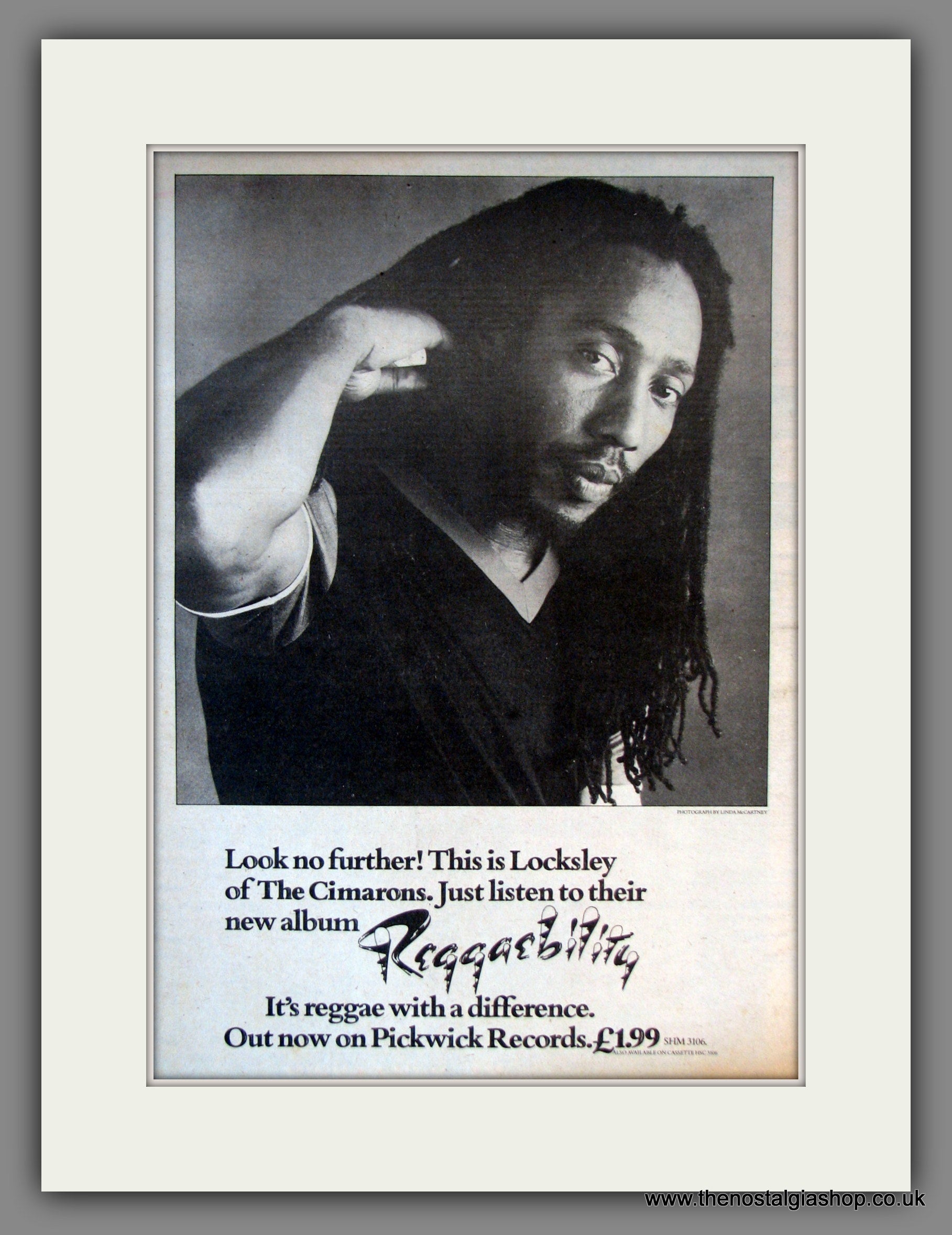 Cimarons (The) Reggaebility. Original Advert 1982 (ref AD11791). Presented and supplied in a cream bevel cut mount with backing card and clear bag. Ready to fit in a 20x16 inch frame. The mounted advert will be posted via courier and well packed - protected with a sheet of hardboard to keep it rigid. Any questions or enquiries, please get in touch, we are here to help! All our adverts, unless clearly stated are originals from the date shown. They make excellent pieces of wall art and stunning gifts. Many are rare and hard to find and once sold, may not be replaced. Remember you are buying a piece of history. Website watermark is not on original.