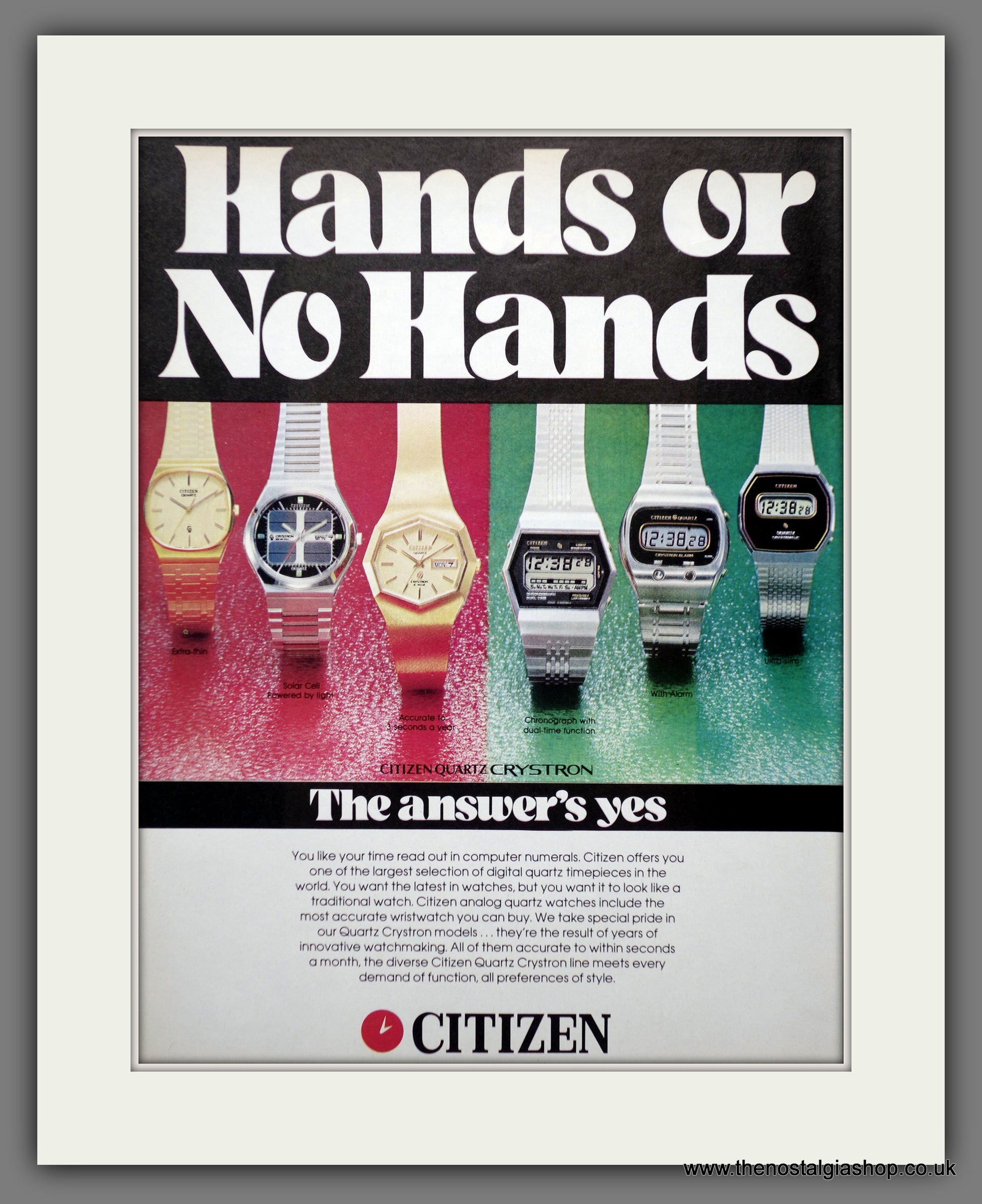 Citizen Watches. Vintage Advert. Original Advert 1977. Presented and Supplied in a cream bevel cut mount with backing card and clear bag. Ready to fit in a 14 x 11 inch frame. All our adverts, unless clearly stated are Originals from the date shown. They make excellent pieces of wall art and stunning gifts. Many are rare and hard to find and once sold, may not be replaced. Remember you are buying a piece of history. Website watermark is not on original.