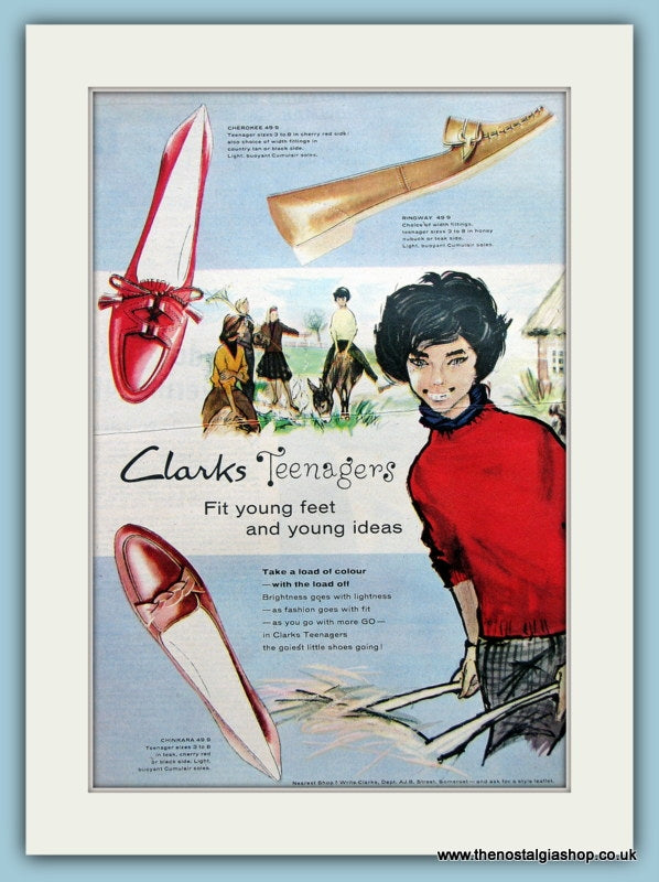 Clarks Teenagers Shoes. Fit young feet and young ideas. Classic original advert 1959. Presented in cream bevel cut mount with backing card and clear bag. Ready to fit in 14 x 11 inch frame. Want it framing? If so, buy this then go to Frames Available Catagory. Click to buy on the suitable frame and we will do the rest. All our adverts, unless clearly stated are Originals from the date shown They make excellent pieces of wall art and stunning gifts. Many are rare and hard to find and once sold, may not be replaced. Remember you are buying a piece of history. Website watermark is not on original.