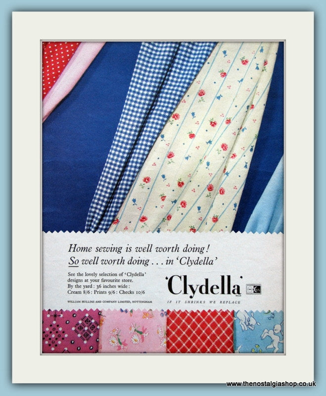 Clydella . Home sewing is well worth doing!Classic original advert 1963. Presented in cream bevel cut mount with backing card and clear bag. Ready to fit in 14 x 11 inch frame. Want it framing? If so, buy this then go to Frames Available Category. Click to buy on the suitable frame and we will do the rest. All our adverts, unless clearly stated are Originals from the date shown They make excellent pieces of wall art and stunning gifts. Many are rare and hard to find and once sold, may not be replaced. Remember you are buying a piece of history. Website watermark is not on original.