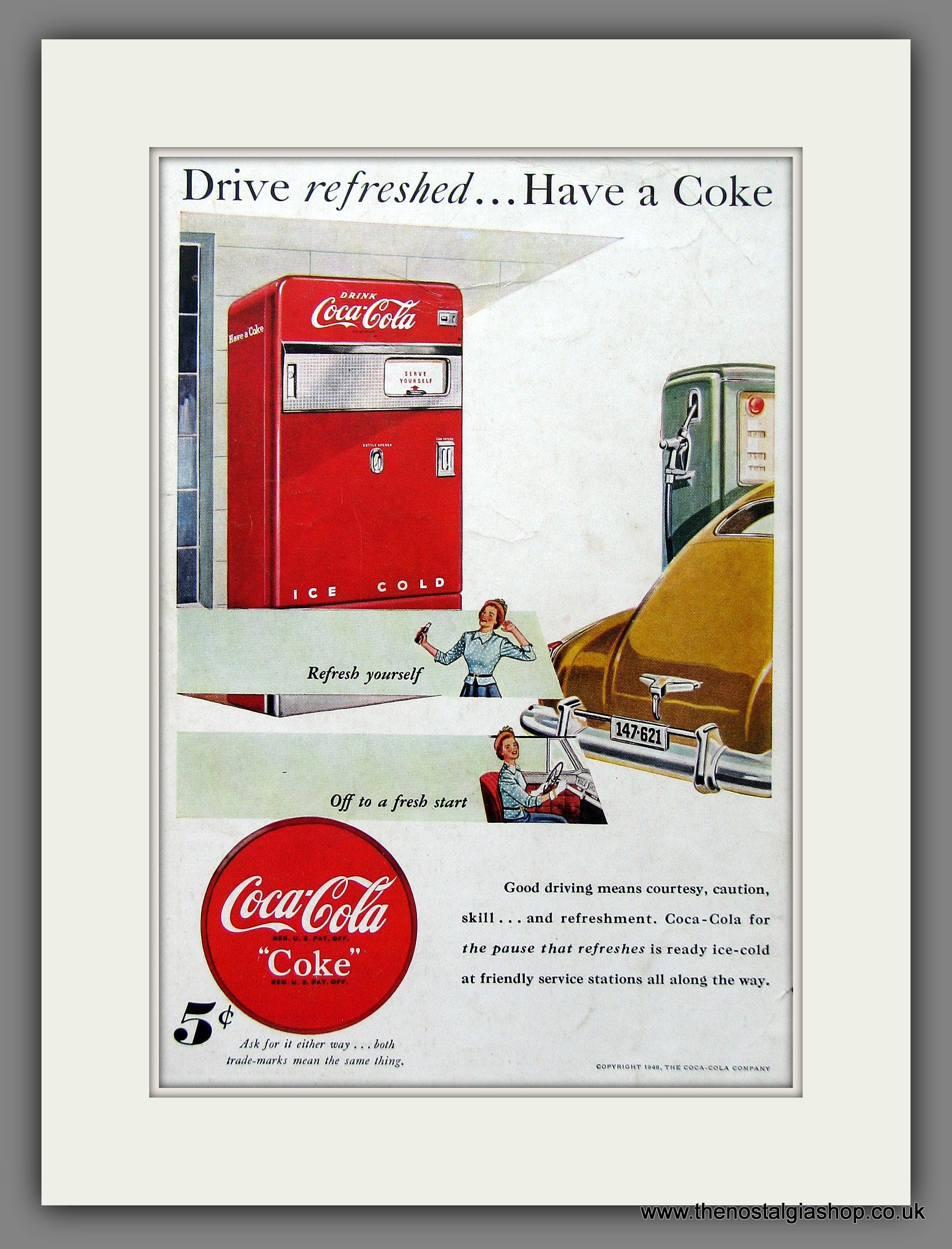 Coca Cola. Coke. Drive Refreshed. Classic Original Advert 1948. Presented and Supplied in a cream bevel cut mount with backing card and Display bag. Ready to fit in 14 x 11 inch frame. Want it framing? If so, buy this then go to Frames Available Category. Click to buy on the suitable frame and we will do the rest. All our adverts, unless clearly stated are Originals from the date shown. They make excellent pieces of wall art and stunning gifts. Many are rare and hard to find and once sold, may not be replaced. Remember you are buying a piece of history. Website watermark is not on original.