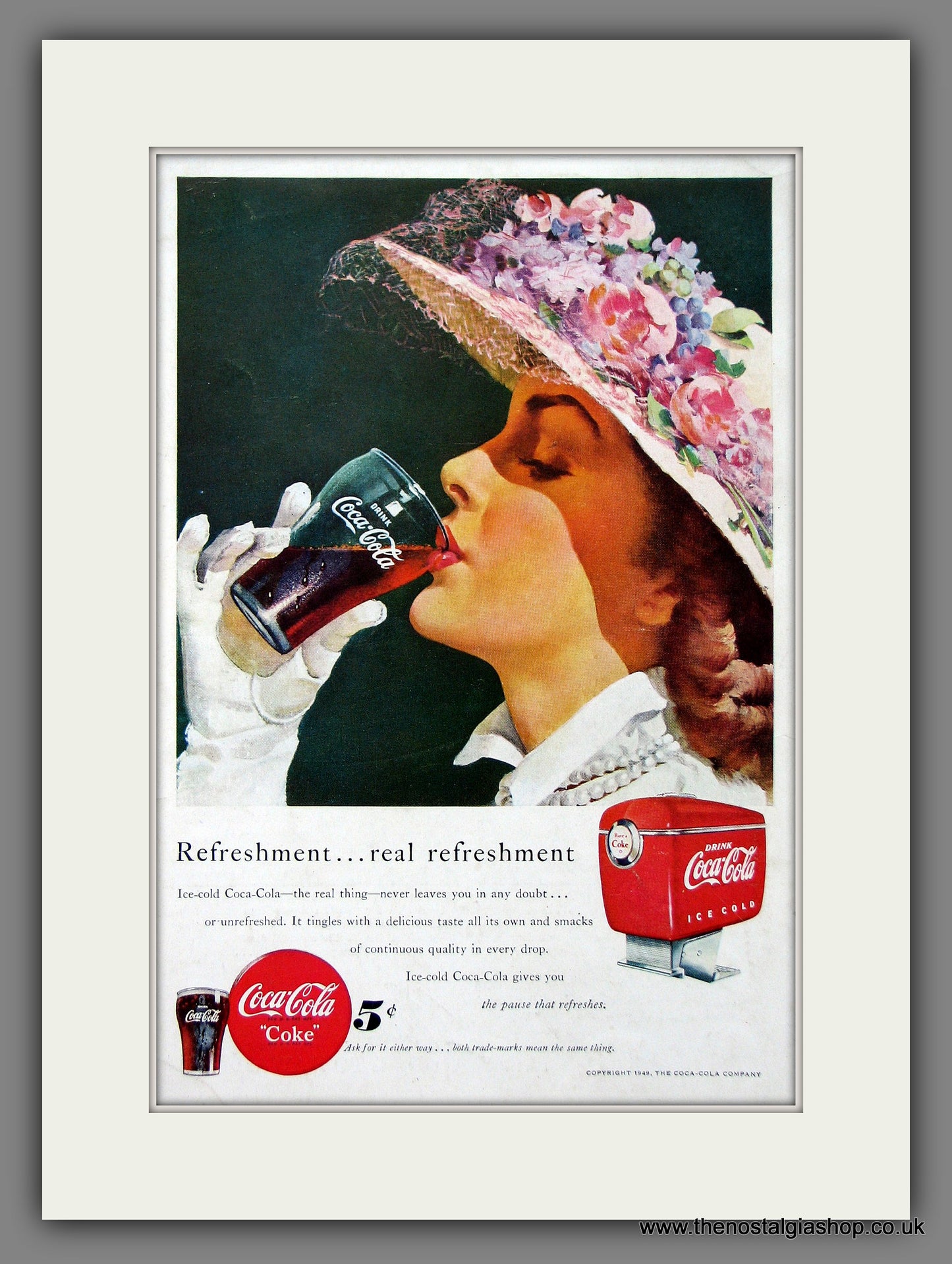 Coca Cola. Coke. Classic original advert 1949. Presented and Supplied in a cream bevel cut mount with backing card and Display bag. Ready to fit in 14 x 11 inch frame. Want it framing? If so, buy this then go to Frames Available Category. Click to buy on the suitable frame and we will do the rest. All our adverts, unless clearly stated are Originals from the date shown. They make excellent pieces of wall art and stunning gifts. Many are rare and hard to find and once sold, may not be replaced. Remember you are buying a piece of history. Website watermark is not on original.