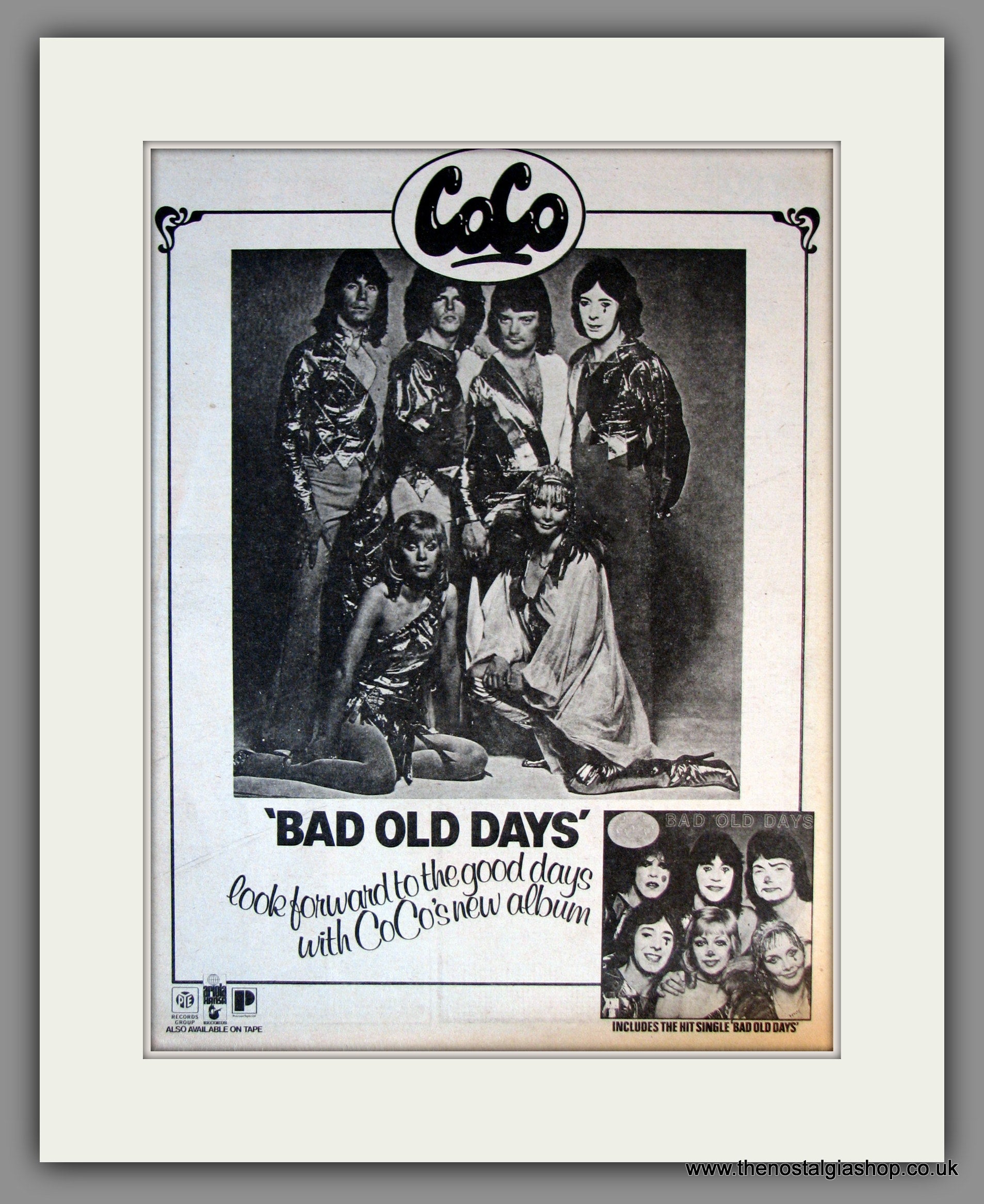 CoCo. Bad Old Days. Original Advert 1978 (ref AD11800). Presented and supplied in a cream bevel cut mount with backing card and clear bag. Ready to fit in a 20x16 inch frame. The mounted advert will be posted via courier and well packed - protected with a sheet of hardboard to keep it rigid. Any questions or enquiries, please get in touch, we are here to help! All our adverts, unless clearly stated are originals from the date shown. They make excellent pieces of wall art and stunning gifts. Many are rare and hard to find and once sold, may not be replaced. Remember you are buying a piece of history. Website watermark is not on original.