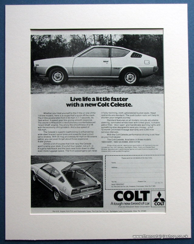 Colt Celeste . Live life a little faster with a new Colt Celeste. Classic original advert 1977. Professionally sealed and presented in cream bevel cut mount with backing card. Ready to fit in 14 x 11 inch frame. Want it framing? If so, buy this then go to Frames Available Catagory. Click to buy on the suitable frame and we will do the rest. All our adverts, unless clearly stated are Originals from the date shown They make excellent pieces of wall art and stunning gifts. Many are rare and hard to find and once sold, may not be replaced. Remember you are buying a piece of history. Website watermark is not on original.