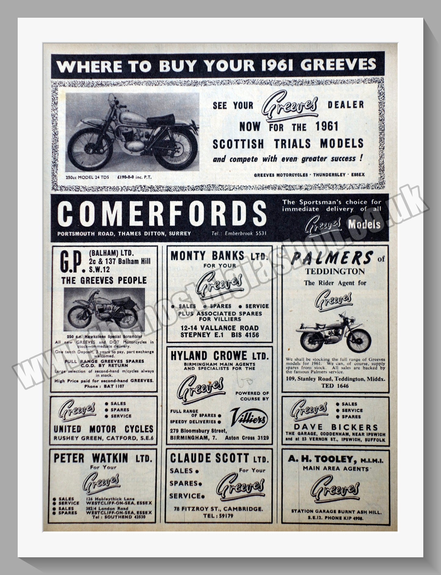Comerfords Ltd Portsmouth Road, Thames Ditton. Motorcycle Dealerships. Classic Original Advert 1960. Presented and Supplied in a 14 x 11 Inch, cream bevel cut mount with backing card and clear bag. Ready to frame. All our adverts, unless clearly stated are Originals from the date shown They make excellent pieces of wall art and stunning gifts. Many are rare and hard to find and once sold, may not be replaced. Remember you are buying a piece of history. Website watermark is not on original. Vintage Motorcycle Dealerships.