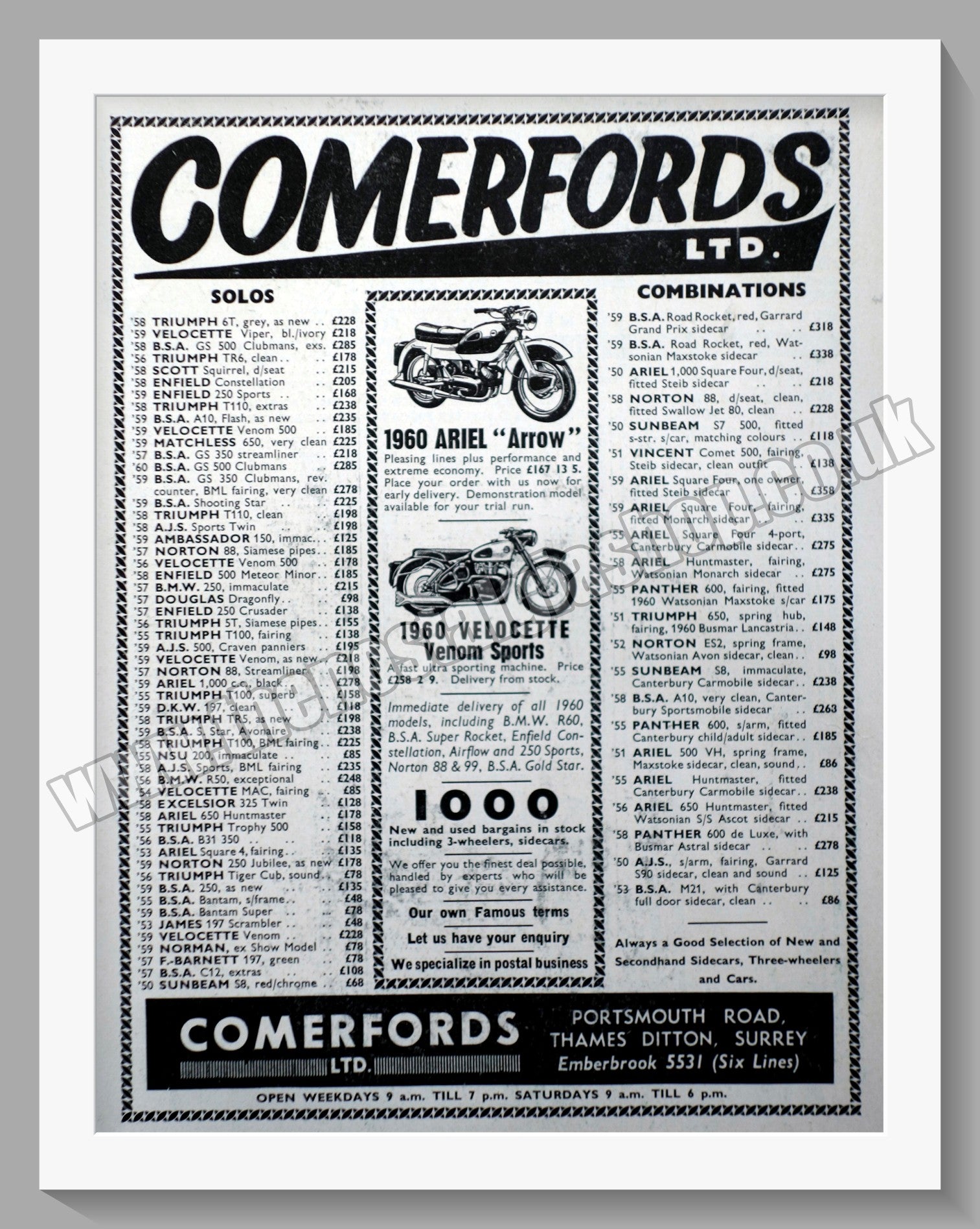 Comerfords Ltd Portsmouth Road, Thames Ditton. Motorcycle Dealerships. Classic Original Advert 1960. Presented and Supplied in a 14 x 11 Inch, cream bevel cut mount with backing card and clear bag. Ready to frame. All our adverts, unless clearly stated are Originals from the date shown They make excellent pieces of wall art and stunning gifts. Many are rare and hard to find and once sold, may not be replaced. Remember you are buying a piece of history. Website watermark is not on original. Vintage Motorcycle Dealerships.