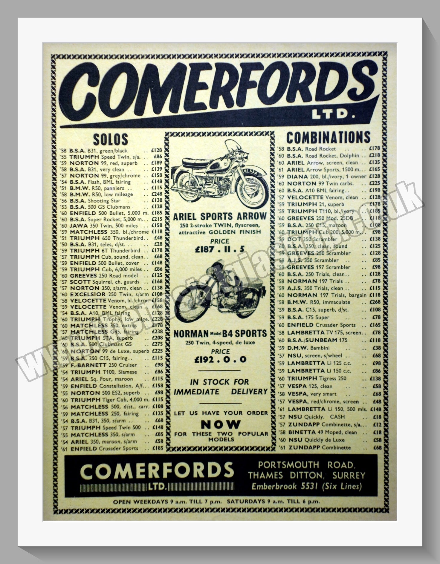Comerfords Ltd Portsmouth Road, Thames Ditton. Motorcycle Dealerships. Classic Original Advert 1961. Presented and Supplied in a 14 x 11 Inch, cream bevel cut mount with backing card and clear bag. Ready to frame. All our adverts, unless clearly stated are Originals from the date shown They make excellent pieces of wall art and stunning gifts. Many are rare and hard to find and once sold, may not be replaced. Remember you are buying a piece of history. Website watermark is not on original. Vintage Motorcycle Dealerships.