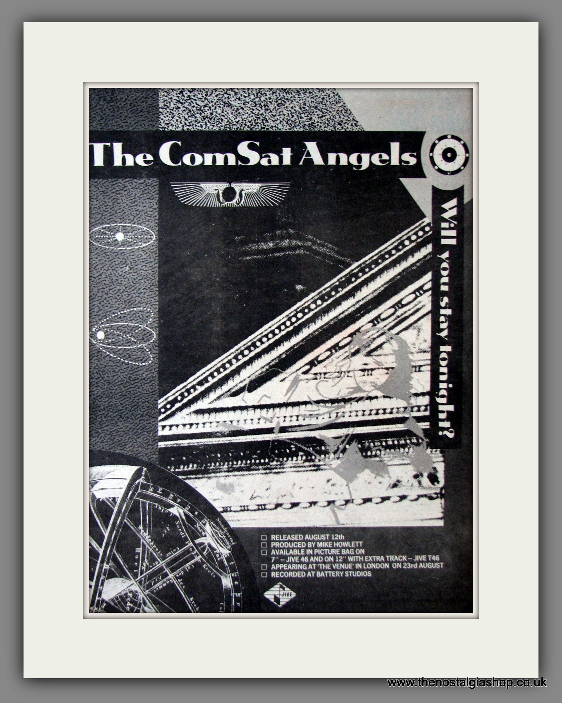 Comsat Angels (The) Will You Stay Tonight. Original Advert 1983 (ref AD11887). Presented and supplied in a cream bevel cut mount with backing card and clear bag. Ready to fit in a 20x16 inch frame. The mounted advert will be posted via courier and well packed - protected with a sheet of hardboard to keep it rigid. Any questions or enquiries, please get in touch, we are here to help! All our adverts, unless clearly stated are originals from the date shown. They make excellent pieces of wall art and stunning gifts. Many are rare and hard to find and once sold, may not be replaced. Remember you are buying a piece of history. Website watermark is not on original.